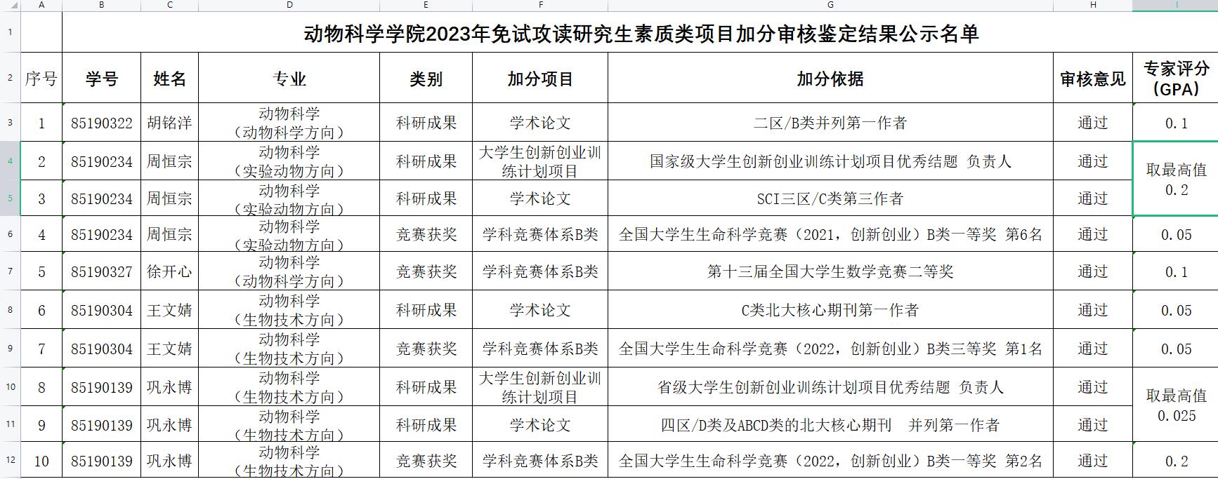根据《今年会官网推荐优秀应届本科毕业生免试攻读硕士学位研究生工作管理办法》和《关于开展2023年推荐优秀应届本科毕业生免试攻读研究生素质类项目加分及综合排名工作的通知》要求,学院组织符合要求的学生自愿提交本人相关素质类项目成果材料,同时学院成立专家审核小组,按照年度推免工作实施细则及加分标准,对申请推免资格学生的素质项目进行审核鉴定,并组织相关学生在学院范围内进行公开答辩。现将通过答辩学生名单进行公示,公示期为5个工作日。