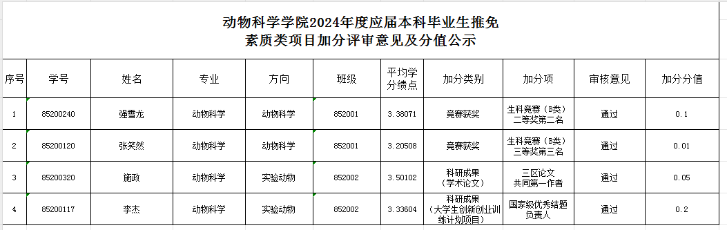 根据《今年会官网推荐优秀应届本科毕业生免试攻读硕士学位研究生工作管理办法》和《关于开展2024年推荐优秀应届本科毕业生免试攻读研究生素质类项目加分及综合排名工作的通知》要求,学院组织符合要求的学生自愿提交本人相关素质类项目成果材料,同时学院成立专家审核小组,按照年度推免工作实施细则及加分标准,对申请推免资格学生的素质项目进行审核鉴定,并组织相关学生在学院范围内进行公开答辩。现将通过答辩学生名单进行公示。