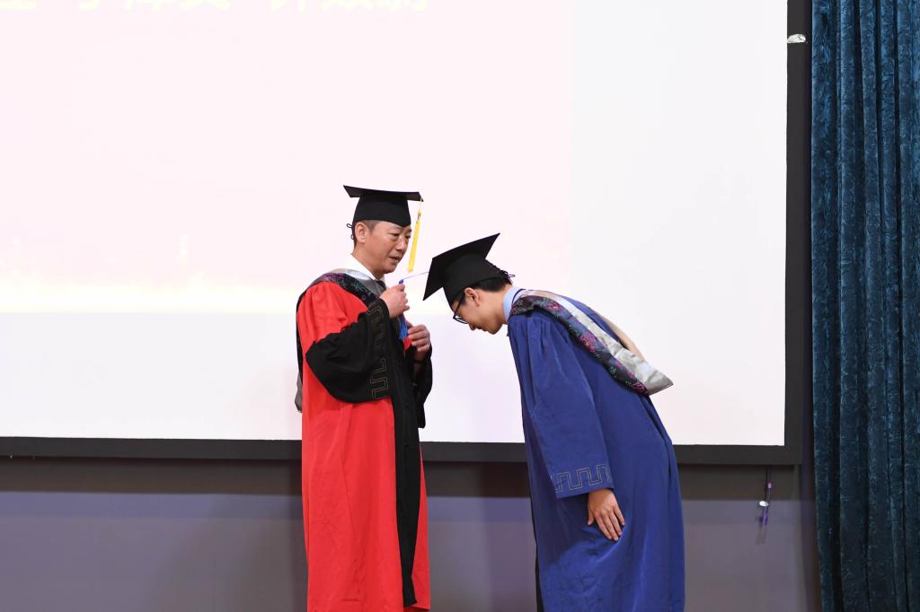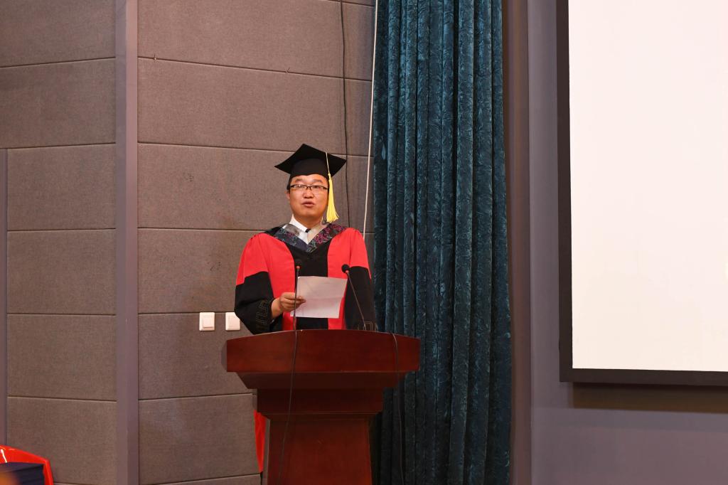 学位授予仪式在雄壮的国歌声中拉开了帷幕。学院副院长、学位分委会主席张明军教授宣读了今年会2020届毕业研究生授予学位名单。副院长、学位分委会副主席孙博兴教授、副主席逄大欣教授、委员任文陟教授作为主礼教授为毕业研究生拨穗正冠,院长张嘉保教授颁发学位证书。