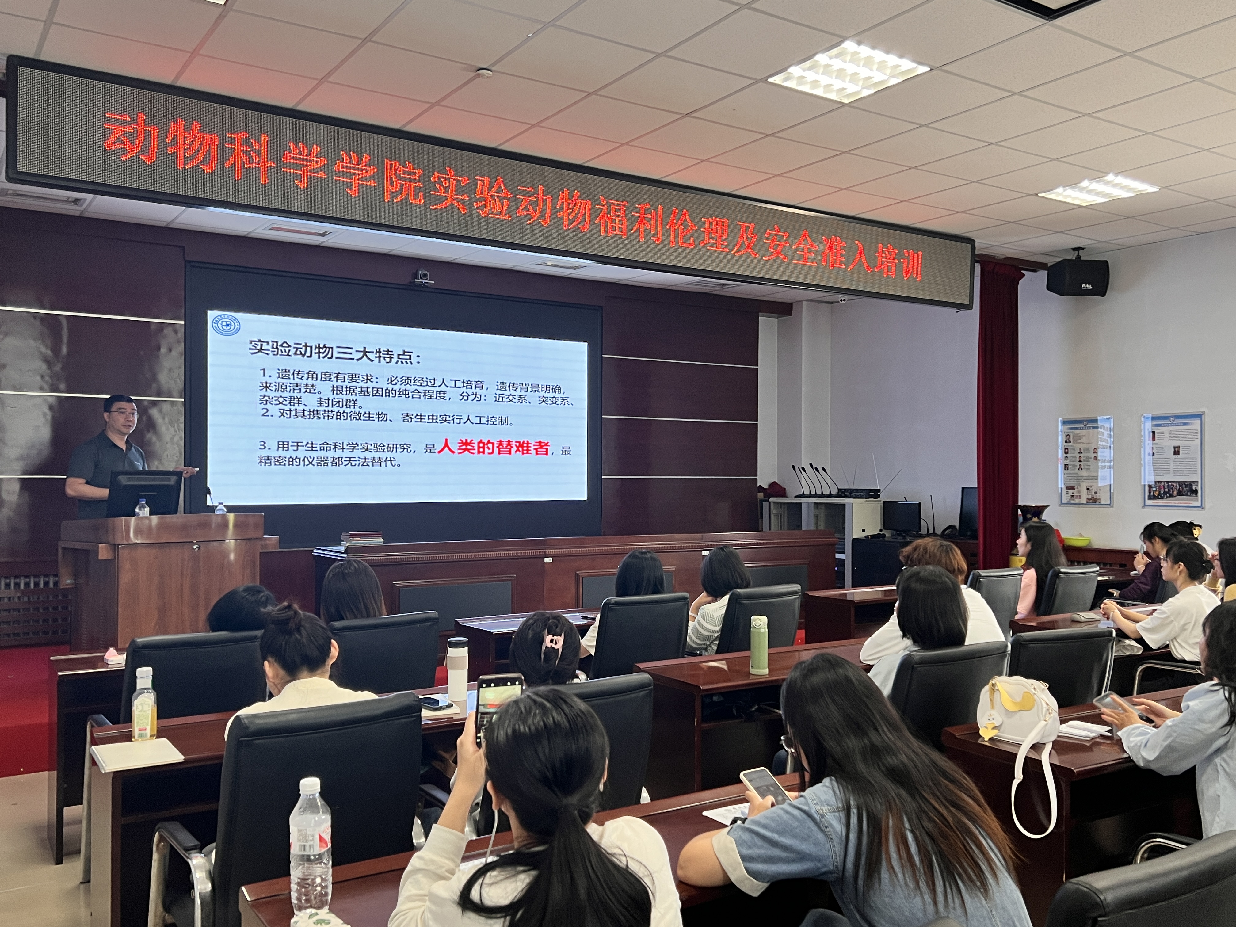 本次培训旨在确保研究生在未来的科研工作中能够坚守伦理标准,保障实验动物的福利,重视实验室安全。袁宝教授表示:“学院一直注重培养学生的伦理和安全意识,特别是在动物科学领域,这一点至关重要。通过这次培训,我们希望能够培养出既有扎实科研能力又具备高度伦理责任感的研究生。”袁宝教授向各位研究生介绍了国家的相关法律法规,与同学们分享个人心得体会并总结道:“我们期待着看到大家在未来的研究工作中取得卓越成就,同时也要强调,只有在严格遵守伦理和安全准则的前提下,科研成果才能得以合法合规产生。”