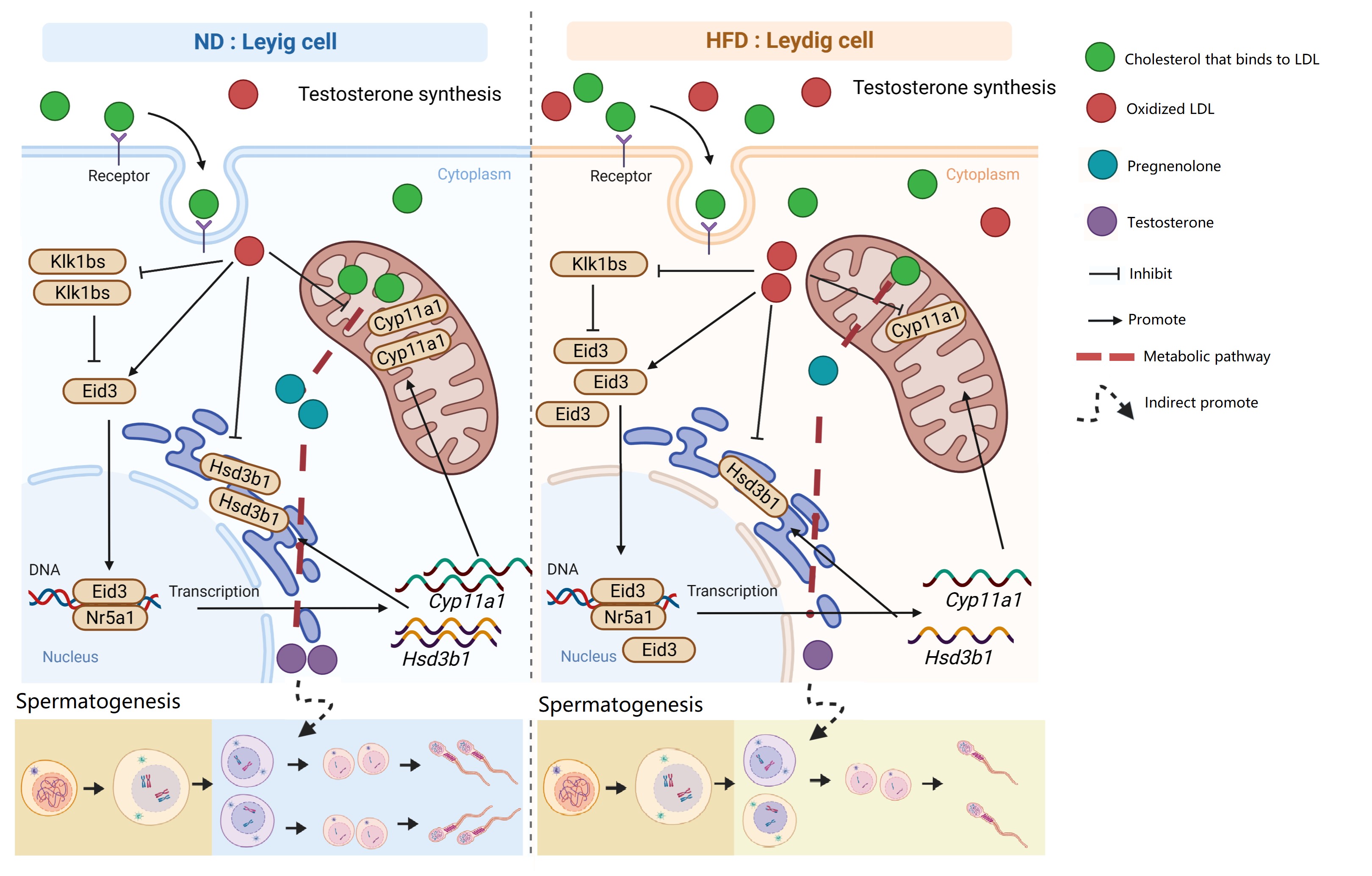 周虚教授课题组长期聚焦动物生殖生理调控机制解析和繁殖新技术研发方面的研究,近年来,围绕畜牧生产中公畜精液品质下降导致繁殖力降低问题展开了系统研究。针对动物营养过剩造成精子质量下降问题,以小鼠为模型,利用单细胞测序技术构建了高脂小鼠睾丸单细胞转录组图谱,发现睾丸间质细胞损伤是造成精子发生的关键因素,并从Klk1bs/Eid3通路解析了其调控机制。该研究为高脂饮食损伤雄性生殖的调控机制提供了新的证据,并为开发针对肥胖引起的生殖损伤的药物提供了新的分子靶点。