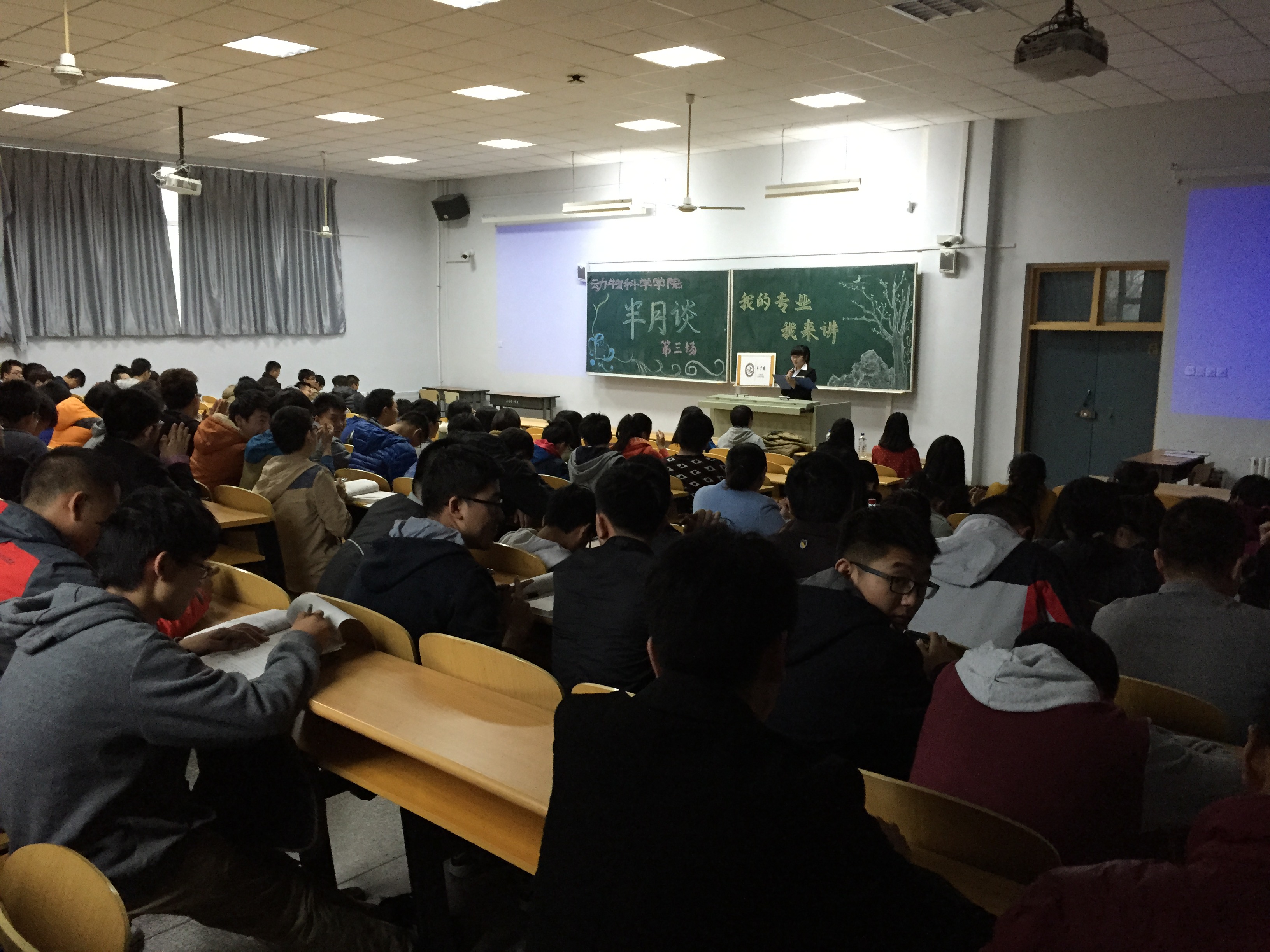 2015年4月2日,周四下午四点,今年会2014级全体本科生齐聚科学讲堂200教室,以热烈的掌声欢迎本期嘉宾2011生物技术(动物)专业的王一名学姐和2012级生物技术(动物)专业的吴志竞学姐参加本次分享会。