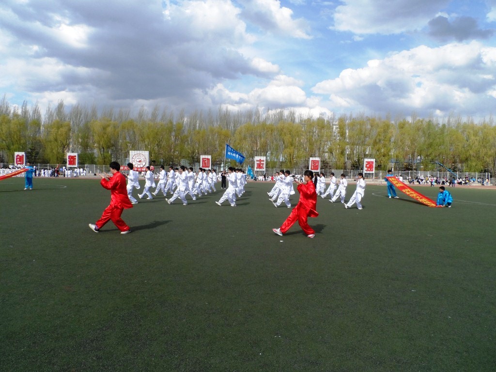 方阵集体跑步上场,步伐整齐,精神昂扬。随着嘹亮的口号――“动科精英,展我雄风;气宇轩昂,再创辉煌”响彻操场,两侧条幅缓缓展开,院旗在方阵的最后被有力的挥舞着,我院的太极拳表演也缓缓揭开了帷幕。同学们身法中正,轻灵沉着,松静自然,意气相随。那款款舒展的动作,丝丝悠长气息,都仿佛将大家带入太极拳的悠然深远的意境之中。最后一个抱拳礼,宣告了我们的表演结束。阵阵掌声响起,那是对我们所有付出的肯定。