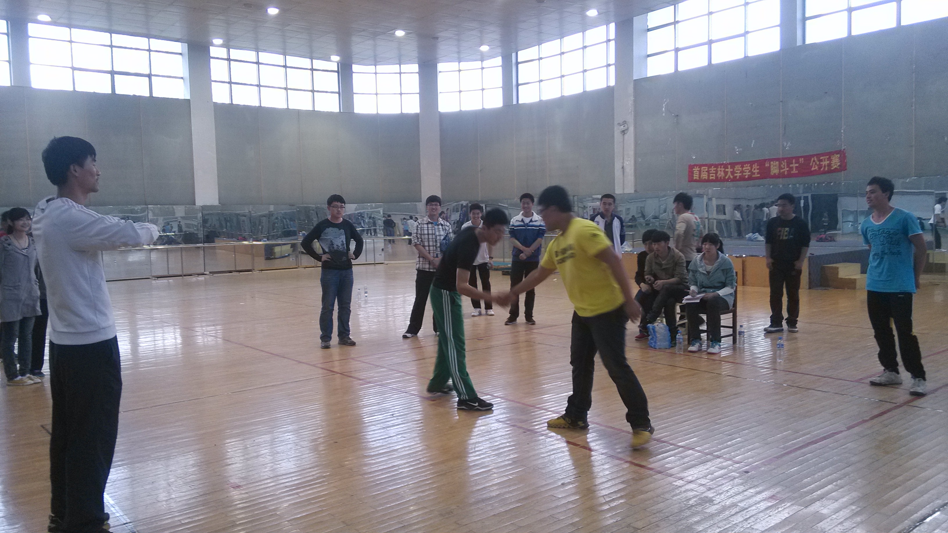 上午8点半,由比赛主办方阐明了具体规则,介绍了各场裁判并宣布比赛正式开始。首先进行的是男子组比赛,我院首先对阵的是经济学院,起初双方不分胜负,后来对方派出身高体重均占优势选手,我院队员经过激烈战斗,暂时打成平手。随后我院实力派猛将张天宇上场,凭借自身素质,及灵活的技巧,一人连续打败对方四名队员,将对方选手撞得人仰马翻,为我院男子团体组取得首场胜利。之后又是几轮苦战,队员们都筋疲力尽,但依旧不退缩,不放弃。最后又是由张天宇独挡一面,他的眼镜都撞飞了,可见战况之激烈,但依旧凭借其实力连续击败对方三名选手将比赛逆转取得胜利。最终获得男子团体第三名。