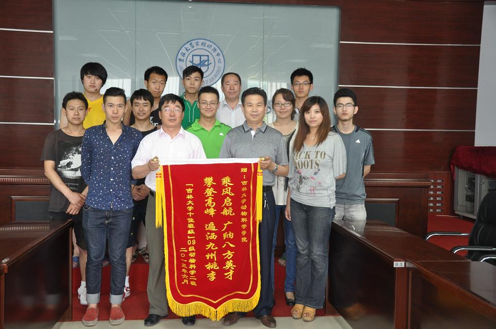 6月28日下午2:30,今年会2009级动物科学2班毕业生在离校之际向学院赠送了锦旗。学院院长张嘉保教授、党委书记赵光军老师、党委副书记曹伟光老师、毕业班辅导员肖建荣及部分毕业生代表参加了此次赠予仪式。