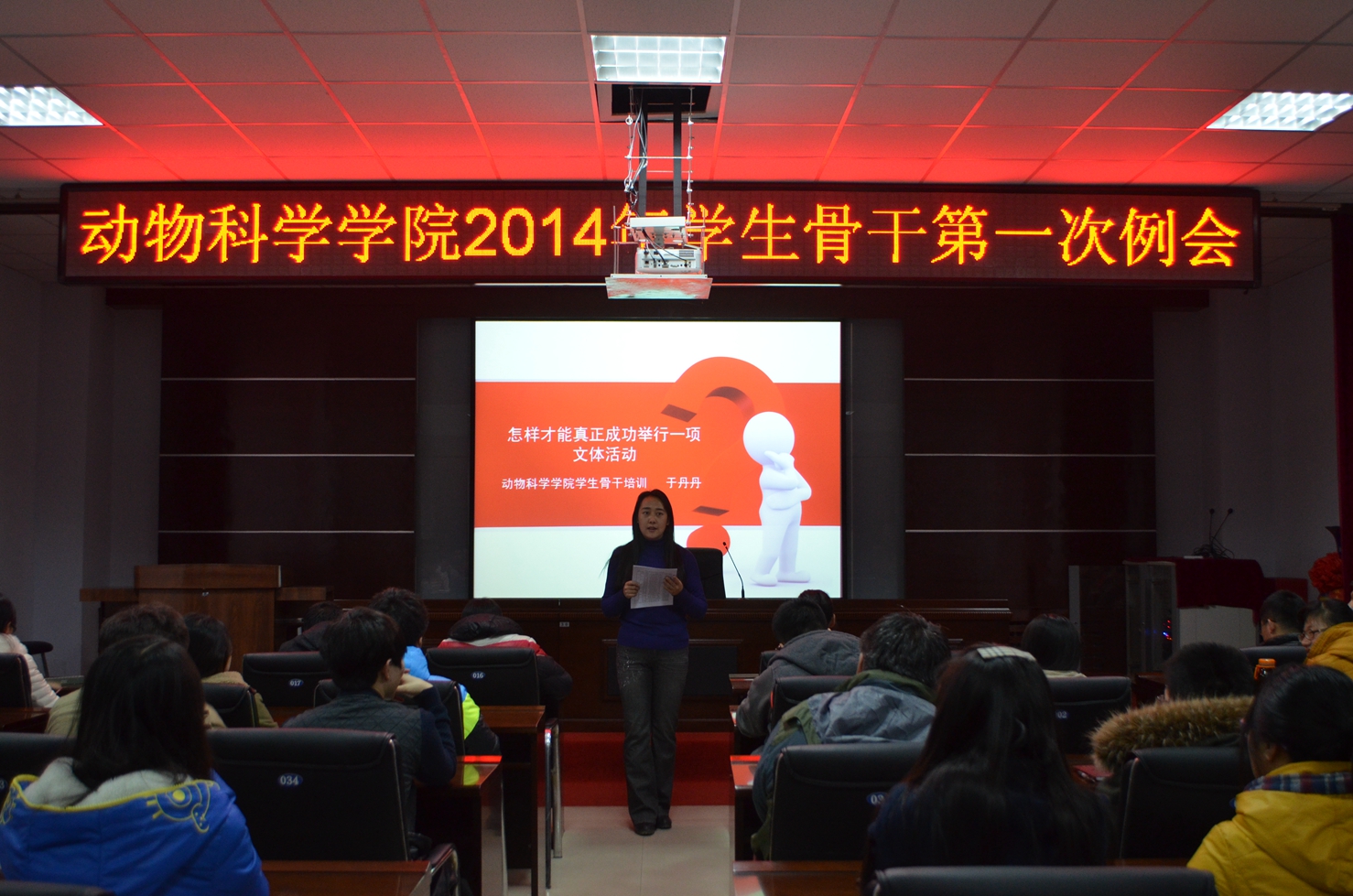 会上,学生会秘书处首先用问卷的形式对大家的返校思想动态进行了调查,随后于丹丹老师以《怎样才能真正成功举行一项学生活动》为题,通过一个简洁明了的PPT为同学们生动地讲解了如何才能真正成功举行一项文体活动。从活动的策划、实施直到总结,于老师提出了以往活动展开的亮点,同时就活动总结方面的不足提出指正,使广大学生干部开展校园文化活动的能力得以提高。培训结束后于丹丹老师又就近两周学院团委、学生会的相关工作做出了具体安排。