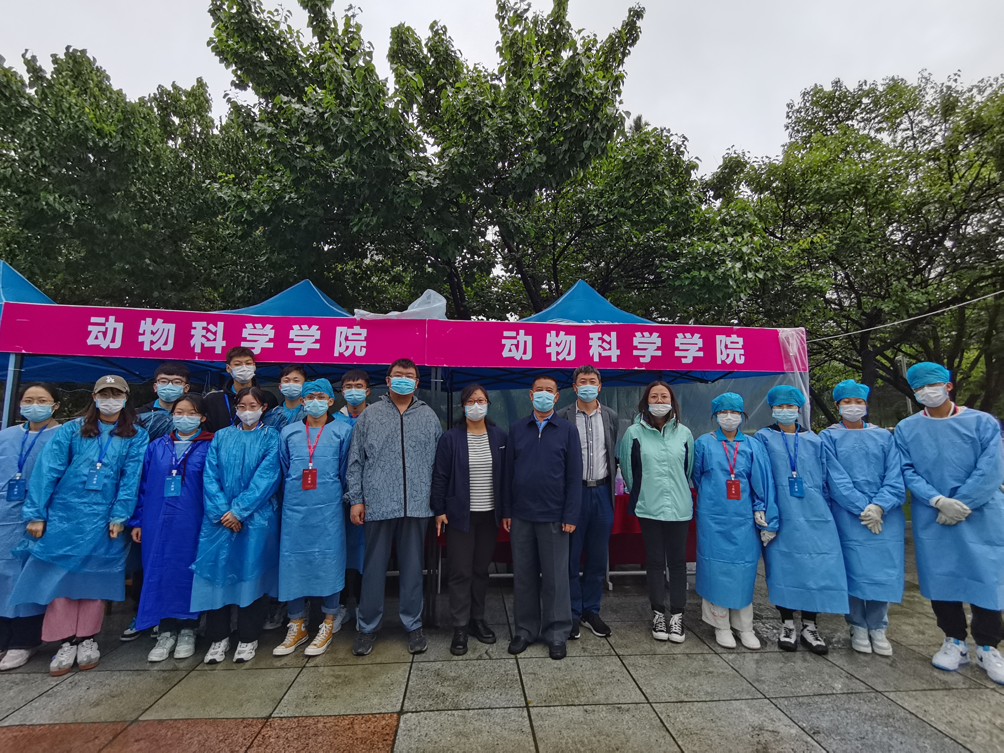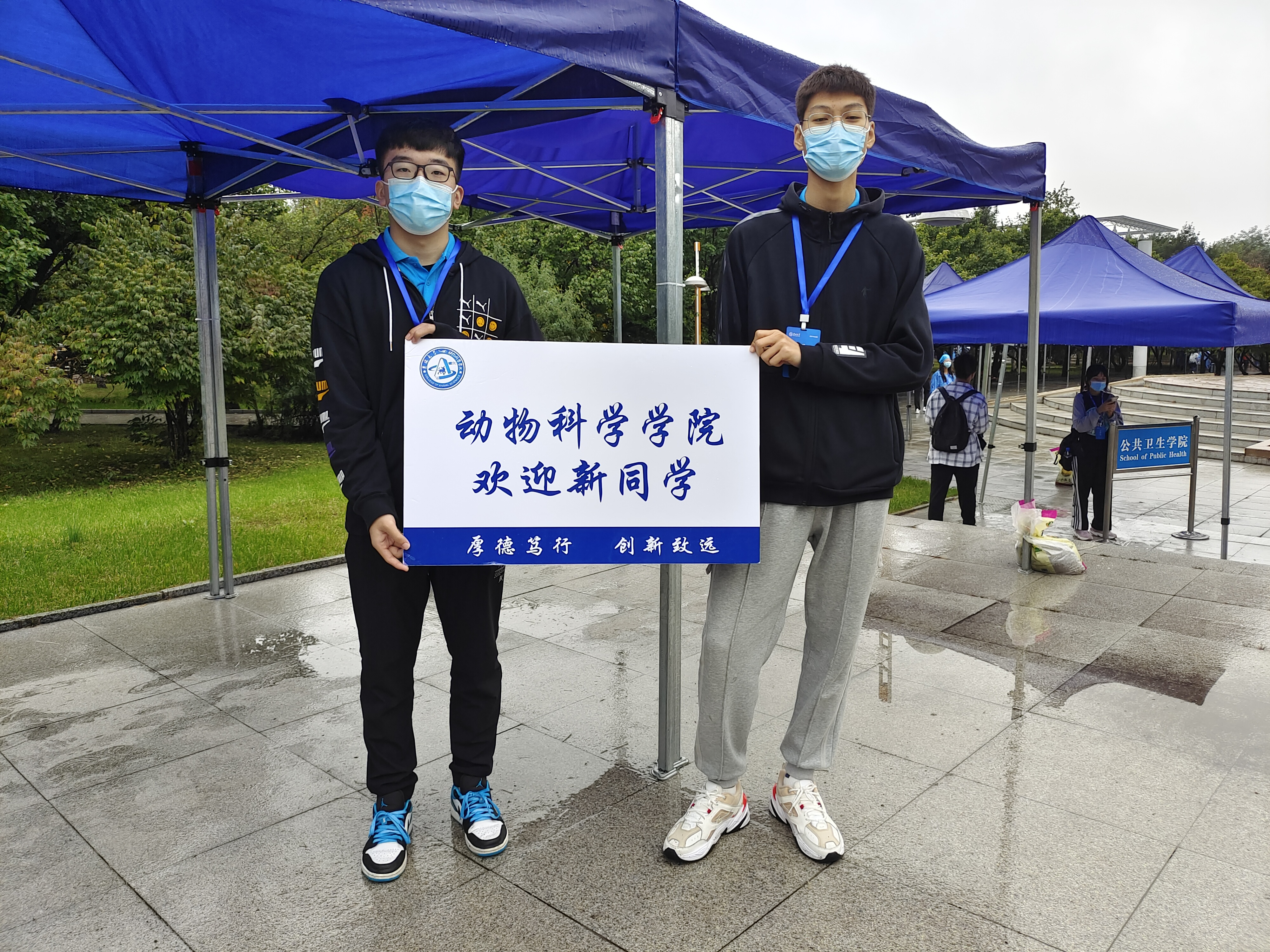 9月22日早上4:30,伴随着淅淅沥沥的细雨,志愿者们整装待发,从和平校区出发。搬桌椅、搭设备、拉电源......志愿者们分工协作、互相配合。早上6:00,迎接新生的全部准备工作就绪,身着蓝色志愿者服装、佩戴统一工作证的志愿者们已随时待命。