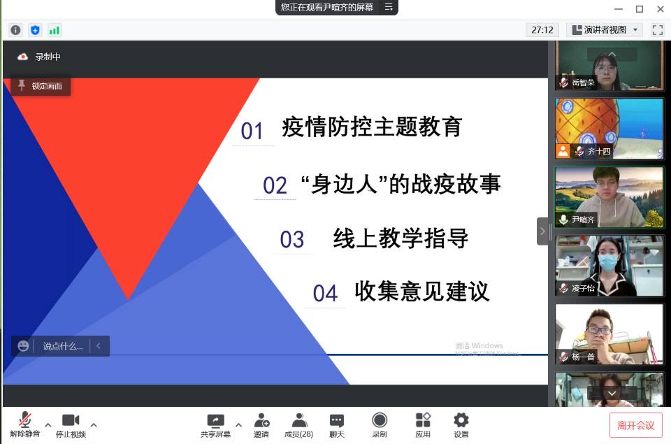 随后,班级各位同学们对做志愿者的经历与身边的暖心小事进行了深入交流。李双瑞同学分享了第一次当志愿者为大家送饭的喜悦;暂缓返校的倪浩博同学虽然人在家中,但是仍关注吉林省以及长春市的疫情形势,期望早日返校;姬星雨分享了自己作为志愿者的快乐以及对大家齐心协力战胜疫情的期望和感动。接着,班主任金永勋和辅导员尹暄齐就大家提出的实际问题一一解惑。会议最后,班主任金永勋告诫大家,要从现在做起,在疫情期间,严格遵从学校和属地的防疫相关要求,准时上课不缺课,认真听课,用知识和专业技能武装自己,为肩负起自己的责任而努力学习。同时,他也希望各位同学在这个特殊时期不要忘记自己的未来规划,坚定选择,不负青春。