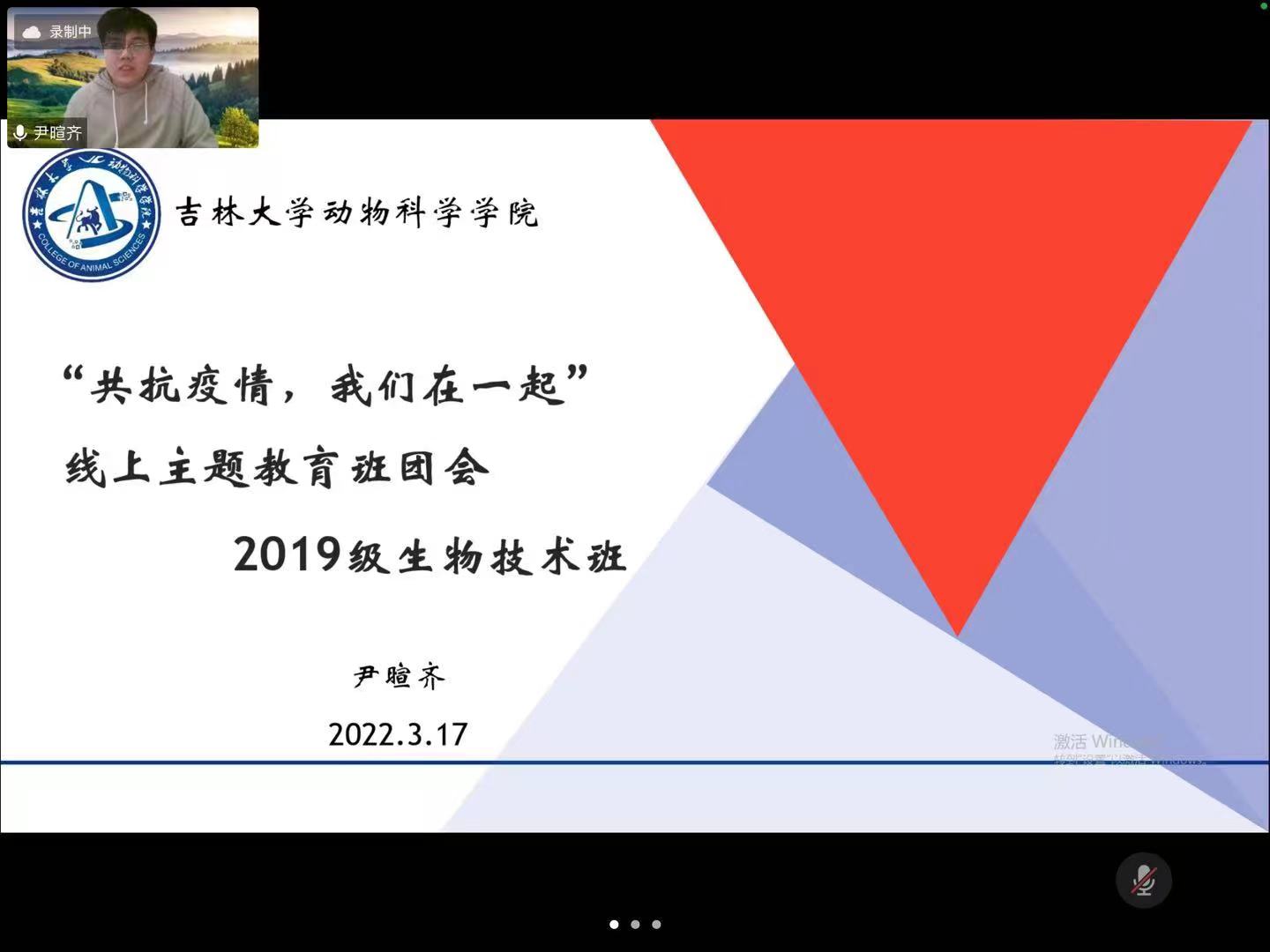 2022年3月17日20时30分,今年会2019级实验动物班级召开召开了“共抗疫情,我们在一起”线上主题教育班团会。此次会议主要围绕当前的疫情形势下同学们如何更好地进行线上学习和封寝生活展开。班主任金永勋以及班级全体同学参与此次会议,会议由辅导员尹暄齐主持。