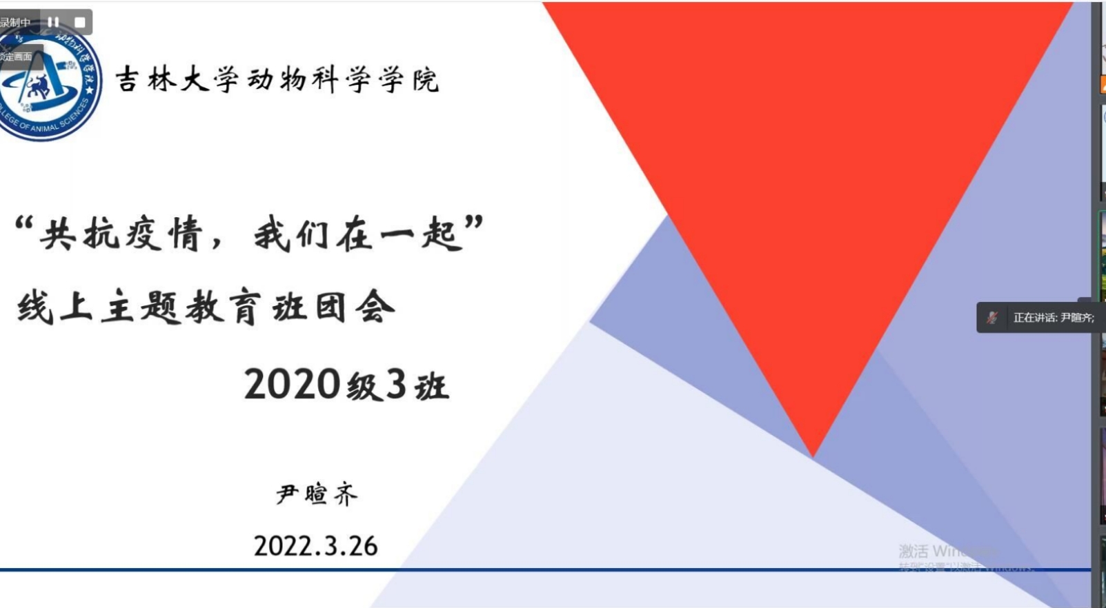 连日来,吉林省疫情形势严峻,多地本土确诊病例和无症状感染者数量持续增加。为明确疫情防控期间基本政策和推进思政教育的线上开展,今年会2020级3班于3月16日晚召开“共抗疫情,我们在一起”线上主题教育班团会。班会由辅导员尹暄齐主持,学院副院长袁宝、班主任丁瑜、2018级刘鑫苗同学以及三班全体同学参加会议。