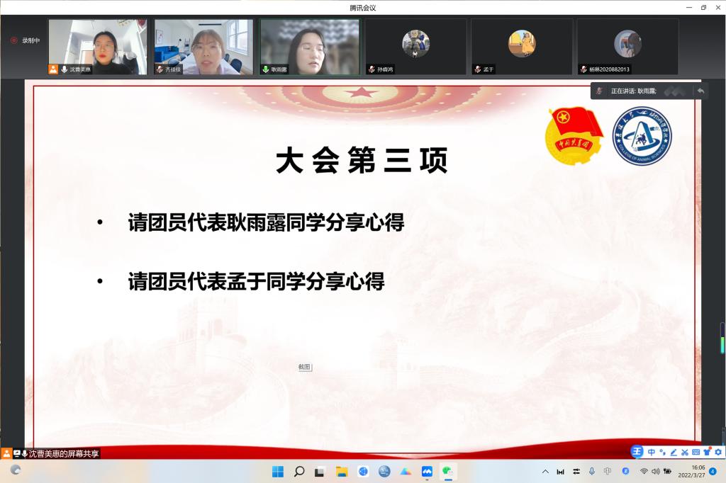 最后,团支部书记沈曹美惠同学传达了会议精神:在这特殊时期,作为共青团的一份子,要勇于彰显青年团员的青春底色,带领全体学生共克时艰,抗击疫情。岁月因青春慨然以赴而更加美好,世间因青年挺身向前而更加瑰丽,党旗所指,团旗所向,同心抗疫,吉大有我!