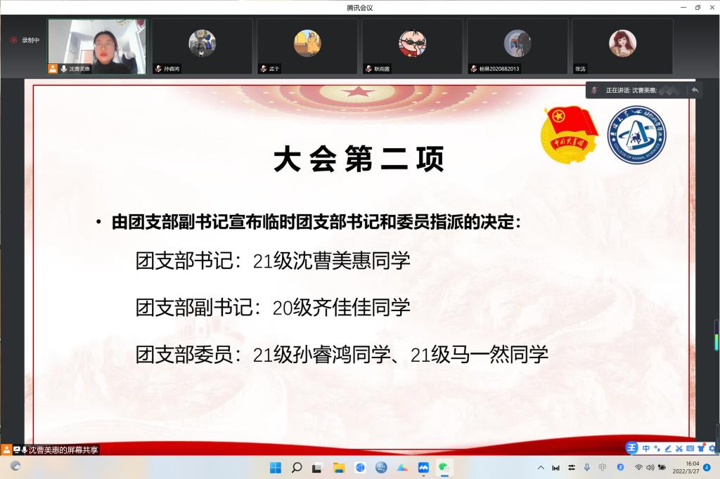 大会第二项,由团支部副书记齐佳佳宣布临时团支部书记和委员指派的决定。今年会第十一临时团支部支委成员如下: 2021级研究生沈曹美惠同学担任团支部书记,2020级齐佳佳同学担任团支部副书记,2021级研究生孙睿鸿同学担任宣传委员,2021级研究生马一然同学担任组织委员。