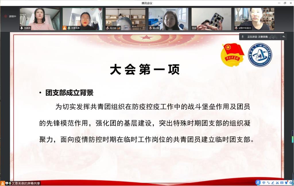 大会第一项,由团支委成员孙睿鸿宣读团支部成立背景及工作任务。为切实发挥共青团组织在防疫控疫工作中的战斗堡垒作用及团员的先锋模范作用,强化团的基层建设,突出特殊时期团支部的组织凝聚力,面向疫情防控时期在临时工作岗位的共青团员建立临时团支部。临时团支部任务主要包括:组织凝聚、沟通信息,互相帮助、解决困难,开展活动、疏导情绪。