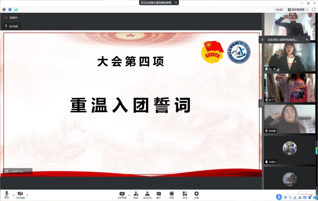 大会第四项,由团支委成员马一然带领大家重温入团誓词。重温入团誓词,就是要再次唤醒团员们入团时的铮铮誓言,增强“勤奋学习,积极工作”的责任意识,增强“吃苦在前,享受在后”的奉献精神,在疫情期间,能够真正发挥起共青团员先锋模范作用,主动亮身份、挑重担,为同学们做实事,为共产主义作奋斗。