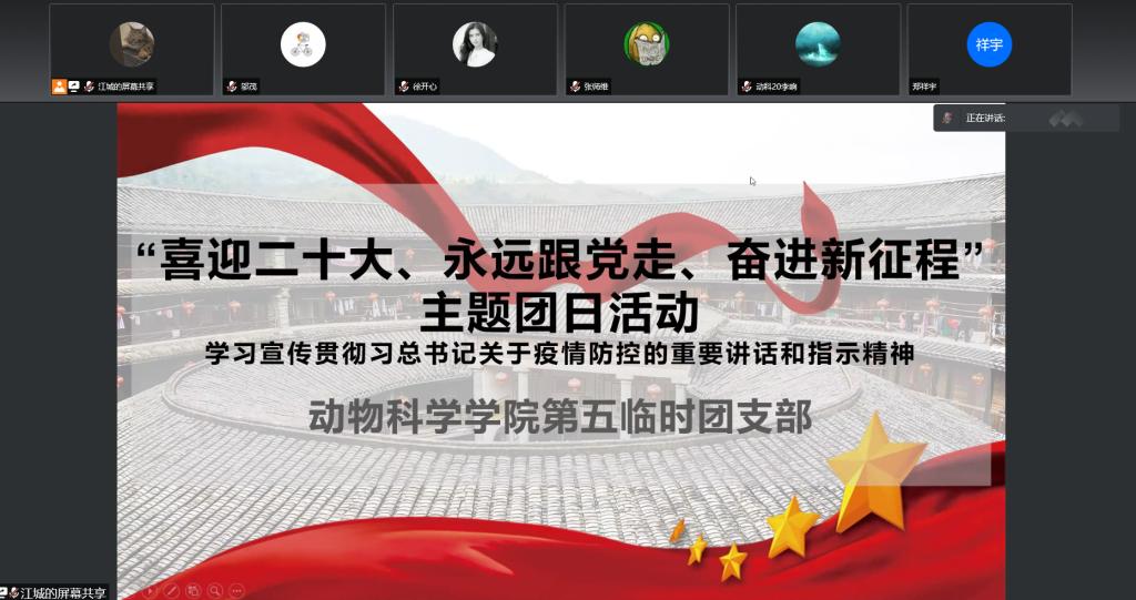 为学习宣传贯彻习近平总书记关于疫情防控工作的重要讲话指示精神,认真学习各级党委和政府的疫情防控工作部署,教育广大团员青年遵守疫情防控要求,执行学校、学院疫情防控工作各项规定,学院应校团委要求,指示今年会各临时团支部举办相关主题团日活动。2022年4月3日下午14时,今年会第五临时团支部举办“喜迎二十大、永远跟党走、奋进新征程”主题团日活动。主题团日活动由团支部书记于政石同学主持,第五临时团支部支委会成员以及今年会18级动物科学专业、19级动物科学专业、20级三班全体男生参加活动。