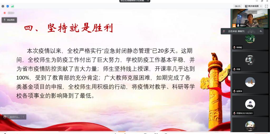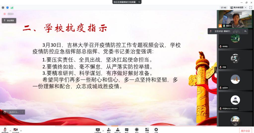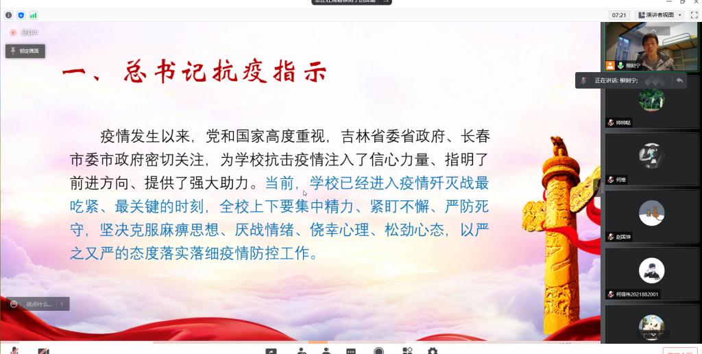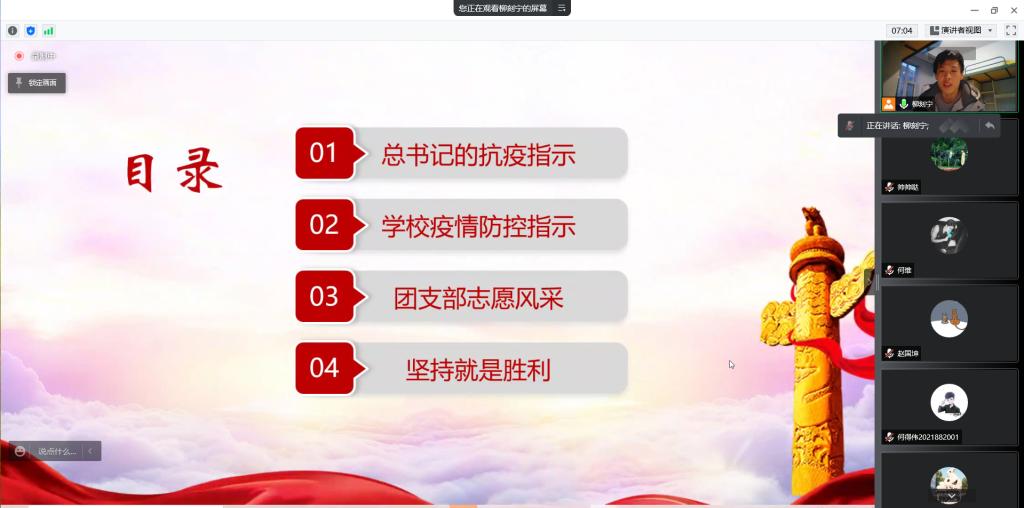 随后,团支部书记柳刻宁围绕总书记的抗疫指示、学校疫情防控指示、团支部志愿风采、坚持就是胜利等四个方面进行讲解。
