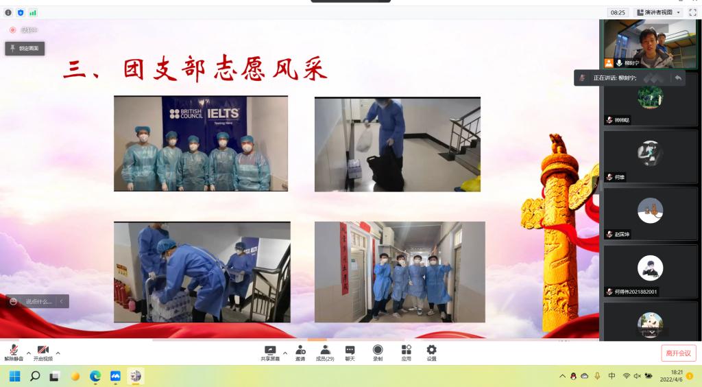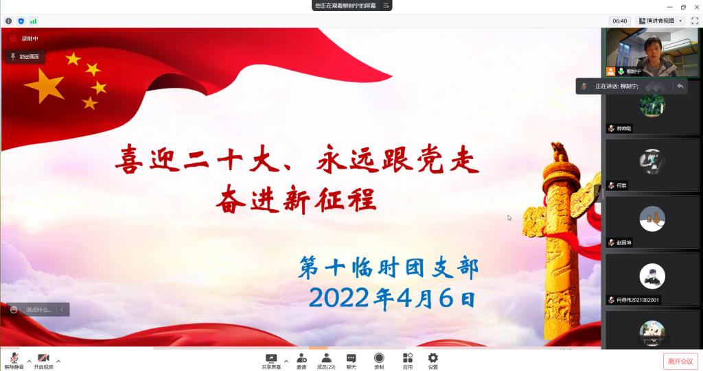 为学习贯彻习近平总书记关于疫情防控工作的重要指示精神、认真学习各级党委和政府的疫情防控工作部署,教育广大团员青年遵守疫情防控要求,执行学校、学院疫情防控工作各项规定,保证每日作息健康规律,保证充足学习时间。今年会第十临时团支部于4月6日晚6时召开“喜迎二十大,永远跟党走,奋进新征程”为主题的团日活动。此次会议采取线上腾讯会议的形式举行,第十临时团支部全体团员参与了此次活动。会议由团支部副书记任中帅主持。