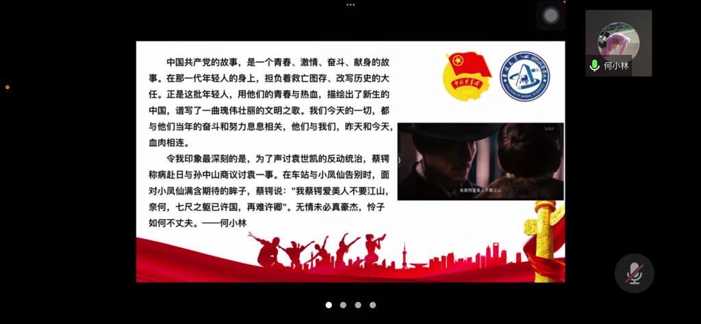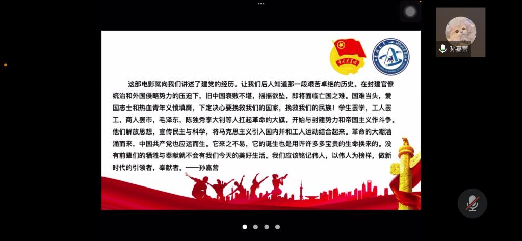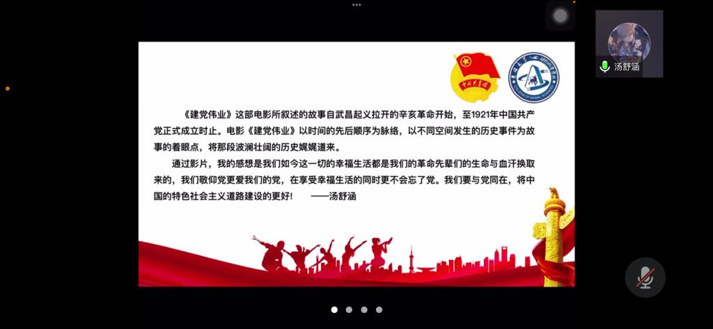 为弘扬爱国主义精神,丰富封校隔离期间学生的生活,加强学生团员的思想教育,使同学们正确认识祖国的历史和现实,增强爱国感情和振兴祖国的责任感,今年会第七临时团支部举办了爱国主义电影《建党伟业》观影活动,并于2022年4月3日下午14时依托腾讯会议召开“《建党伟业》观后感”线上分享会。活动由临时团支部书记苏廖枷域主持,支部全体成员参加。