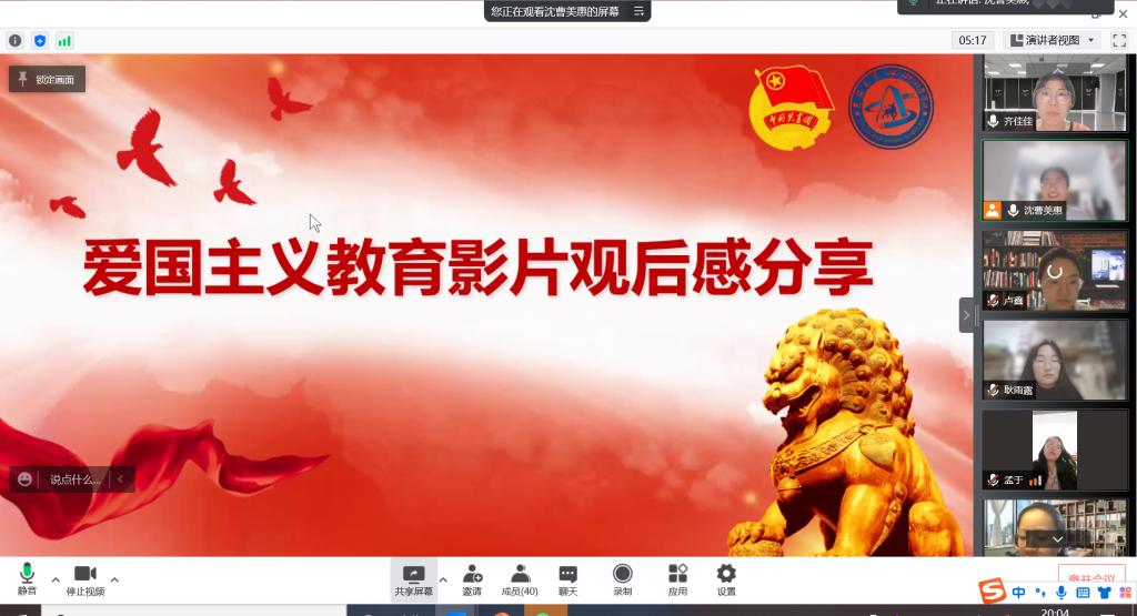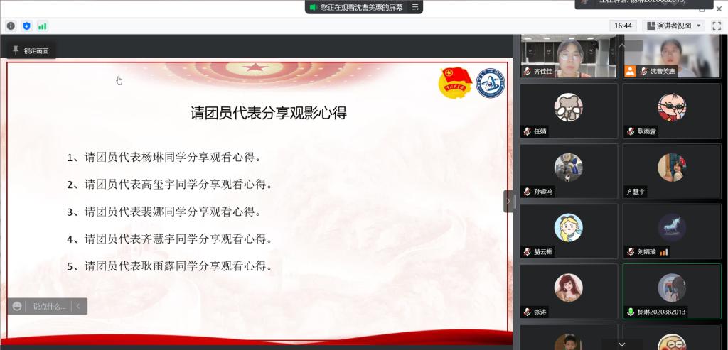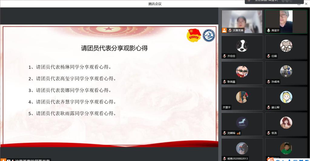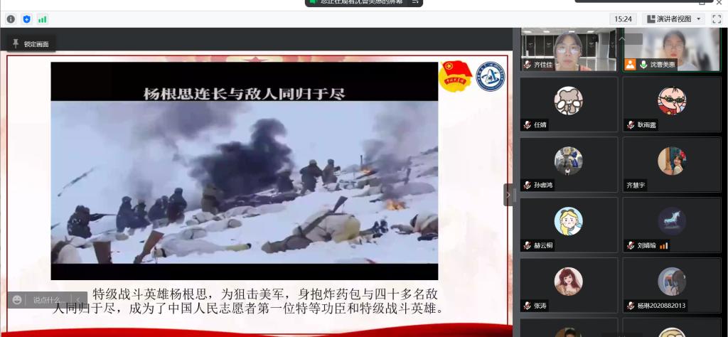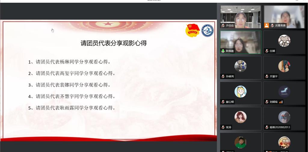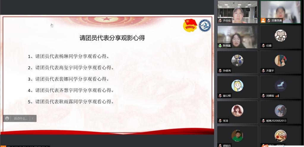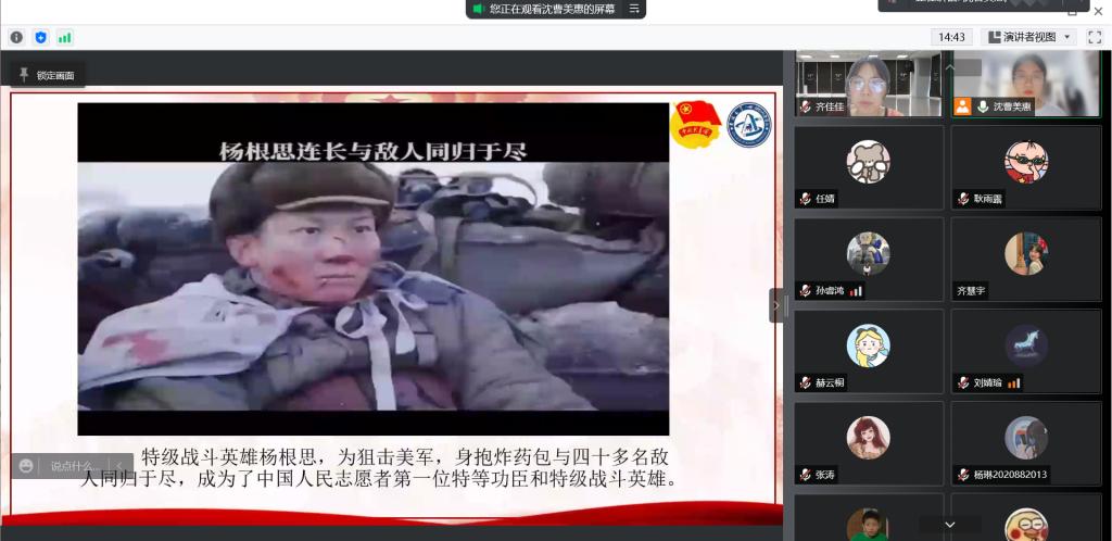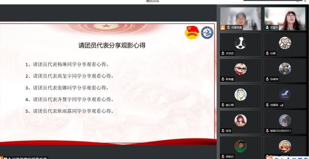 为深入开展爱国主义教育活动,进一步支部同学对党光荣发展历史的认识,2022年4月8日下午19:30,今年会第十一临时团支部依托腾讯会议组织开展了“观看红色影视作品”之分享《白山黑水铸英魂》、《跨过鸭绿江》、《人世间》等影视活动。团支部全体团员积极参与本次活动。