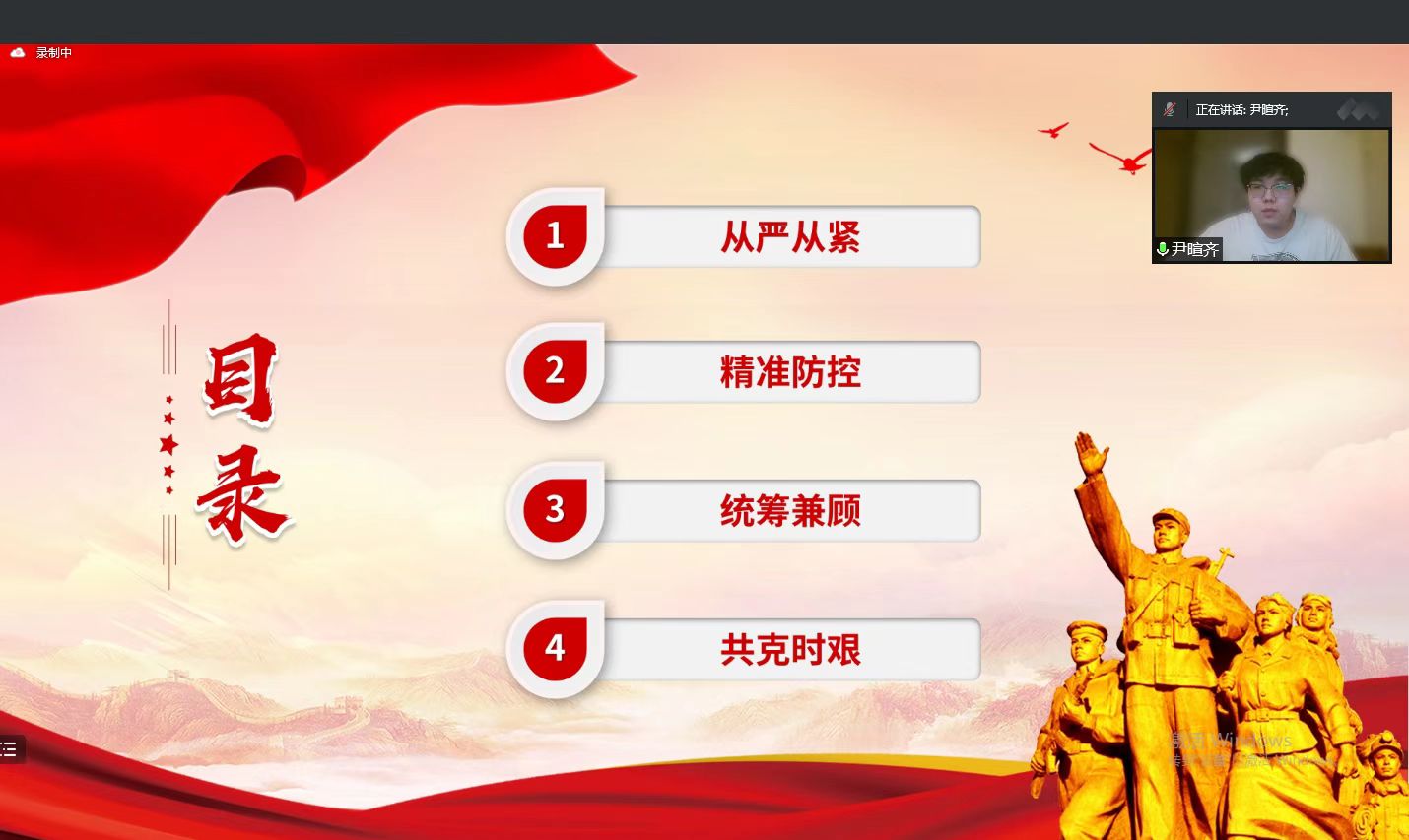 为深入学习贯彻习近平总书记关于“分析新冠肺炎疫情形势,部署从严抓好疫情防控工作”重要讲话精神,2022年4月30日晚7时,今年会本科学生党支部于线上开展战“疫”时不我待,坚持就是胜利——学习习近平总书记关于从严抓好疫情防控工作重要讲话精神,本次会议由学生党员王文婧主持。学院党委副书记肖建荣、学生辅导员尹暄齐、王可佳以及支部全体学生党员参会。