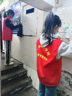(图为志愿者清洁楼梯、门上的广告)