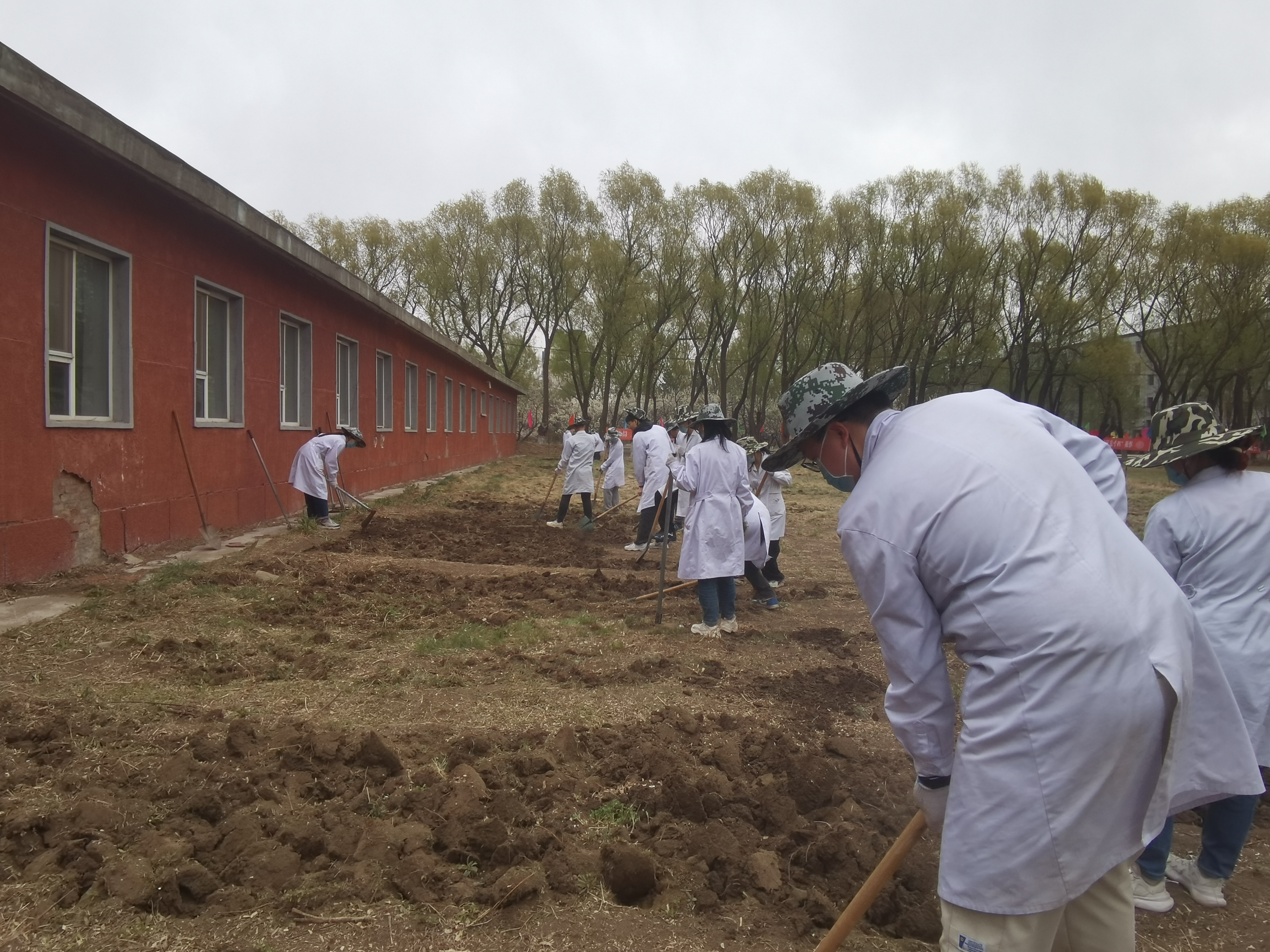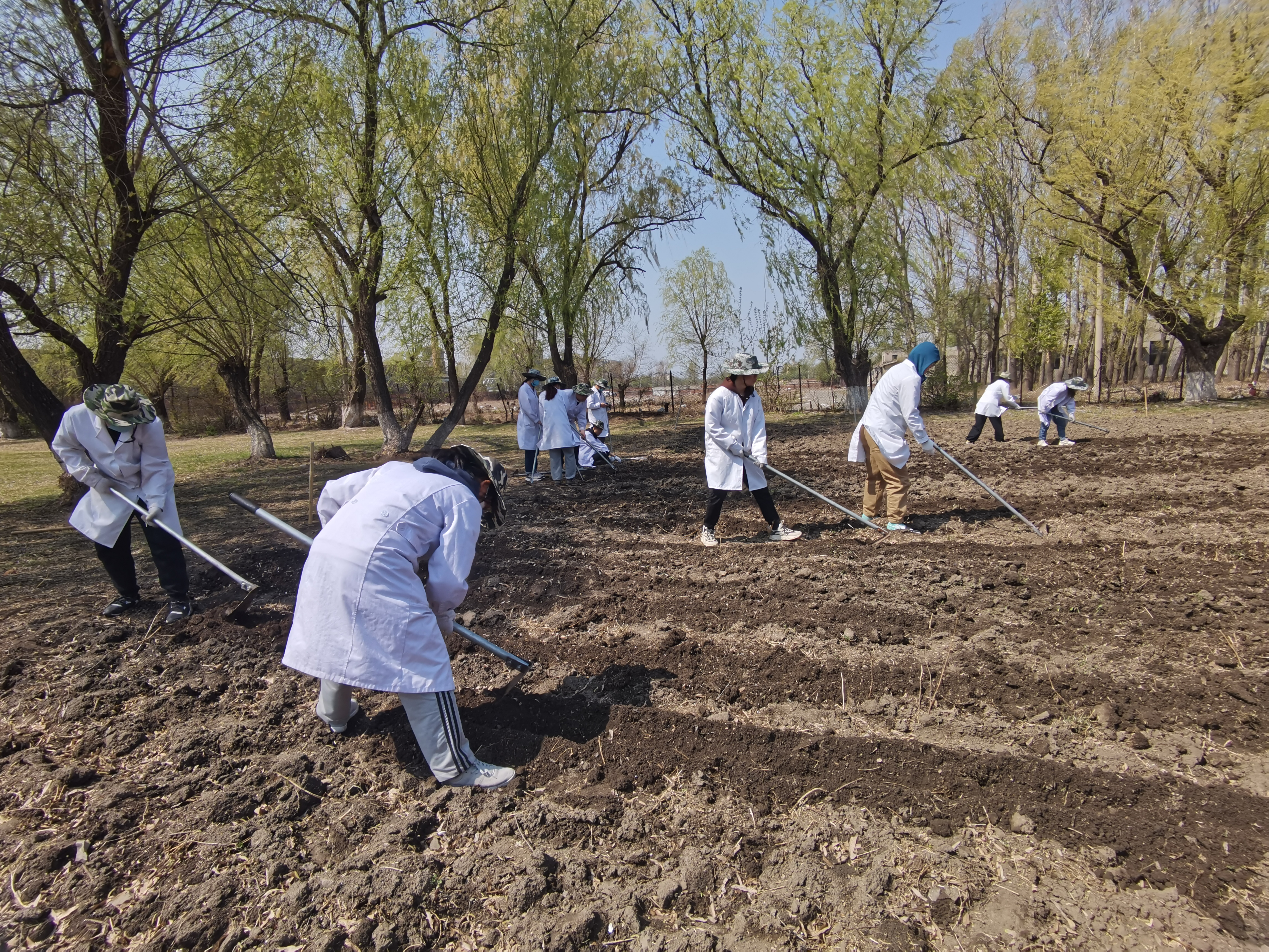 在活动开始的前一天,两名专业课教师为大家讲述了劳动的动作要领及相关注意事项,为同学们分配任务,引导学生正确使用劳动用具。在活动过程中,两位老师亲自拿起锄头,为大家示范起垅的动作要领,讲述每个步骤在牧草生长过程中所起到的作用。活动第一天上午9时,全体人员准时到齐,在专业课老师的带领下前往领取劳动用具,同学们分成六组,每组4人,当天完成了清除杂草的工作。同学们分工明确、默契十足、全心全意投入其中,先后完成了翻耕整地、起垄播种等工作。