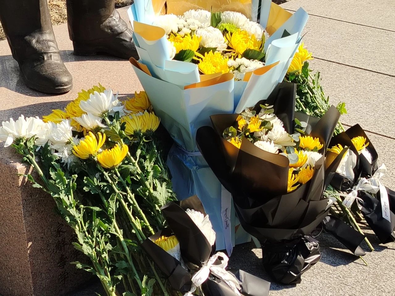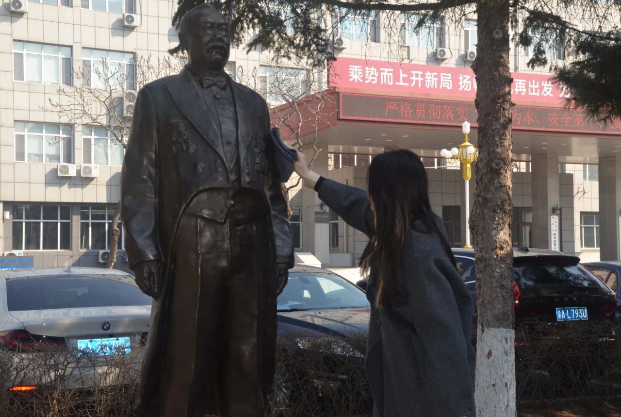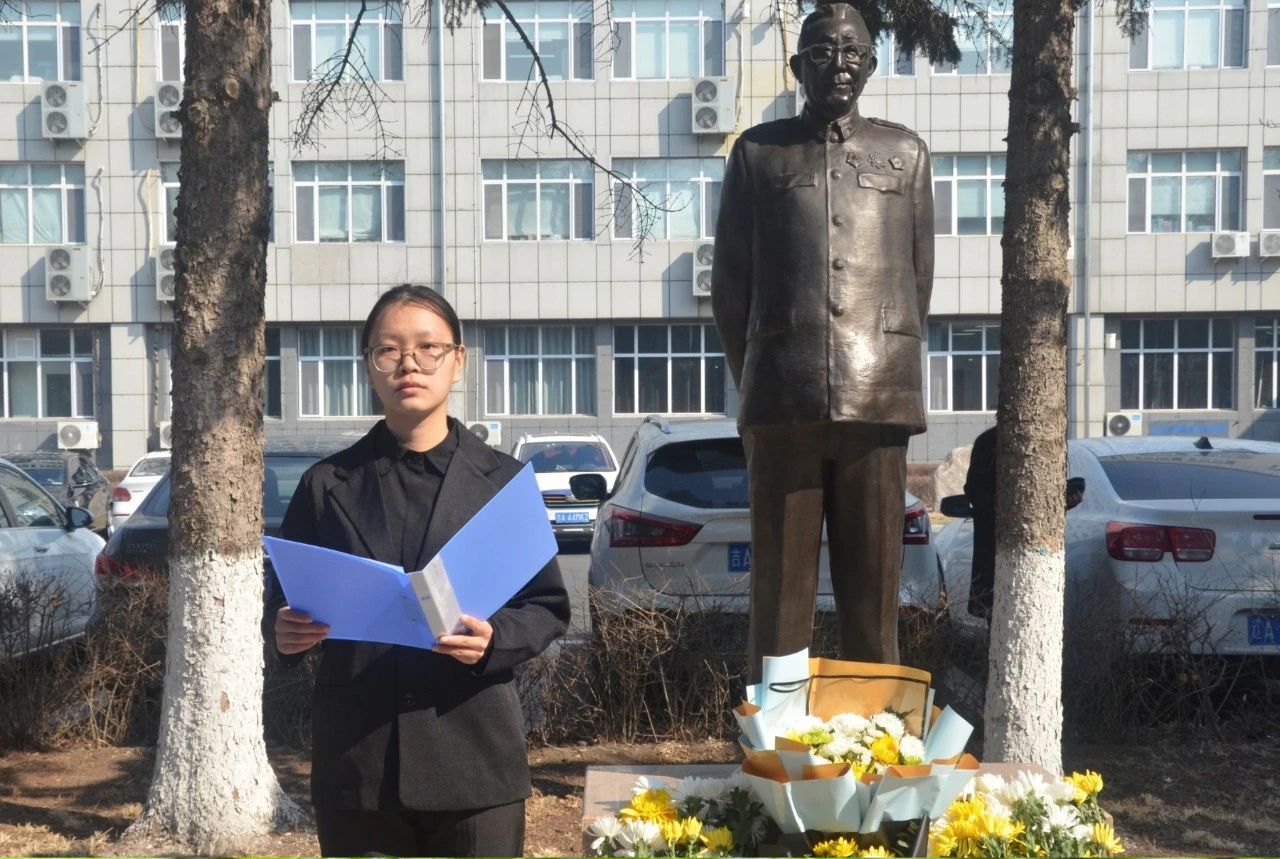 讲述结束后,学生代表缓步上前,仔细擦拭三位先贤的铜像。随后,贾子一老师带领全体成员列队肃立,依次敬献白菊并默哀一分钟。春风拂过,白菊轻颤,铜像熠熠生辉,无声的仪式中凝聚着对先贤的无限敬仰。