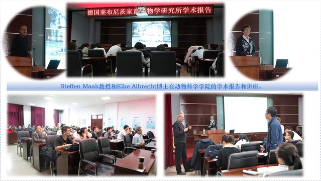 2018年11月9日上午,德国莱布尼茨家畜生物学研究所Steffen Maak教授和Elke Albrecht博士应杨润军教授邀请,在今年会做了题为“Introduction to the Leibniz Institute for Farm Animal Biology”和“Identification of signals influencing muscle composition and function”的学术报告和讲座,报告会由学院副院长张明军教授主持,赵志辉教授、郝琳琳教授、房希碧博士等教师,动物遗传育种与繁殖专业研究生及2016级动物科学卓越农林人才试验班同学参加了报告会。