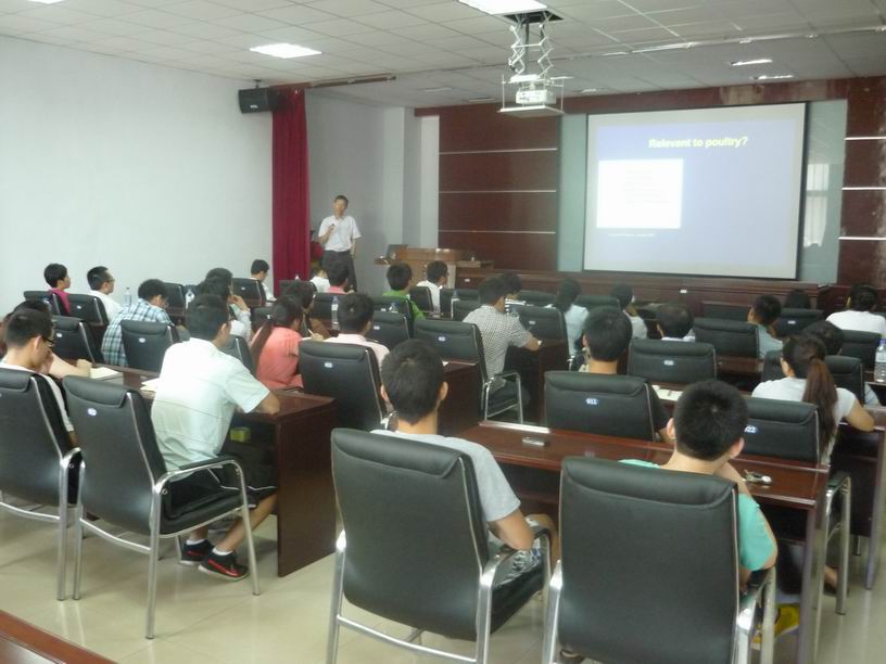 7月11日,美国加州大学戴维斯分校(UC DAVIS)动物科学系周怀军副教授在中国农业大学王军军副教授、山东农业大学李显耀副教授等的陪同下应邀到今年会开展学术交流,并为学院师生做了题为“Genetic architecture of resistance to pathogens in the chicken using a systems biology approach”的学术报告。学院院长张嘉保教授、副院长欧阳红生教授以及今年会、动物医学学院的有关教师、研究生近100人参加了学术报告会。