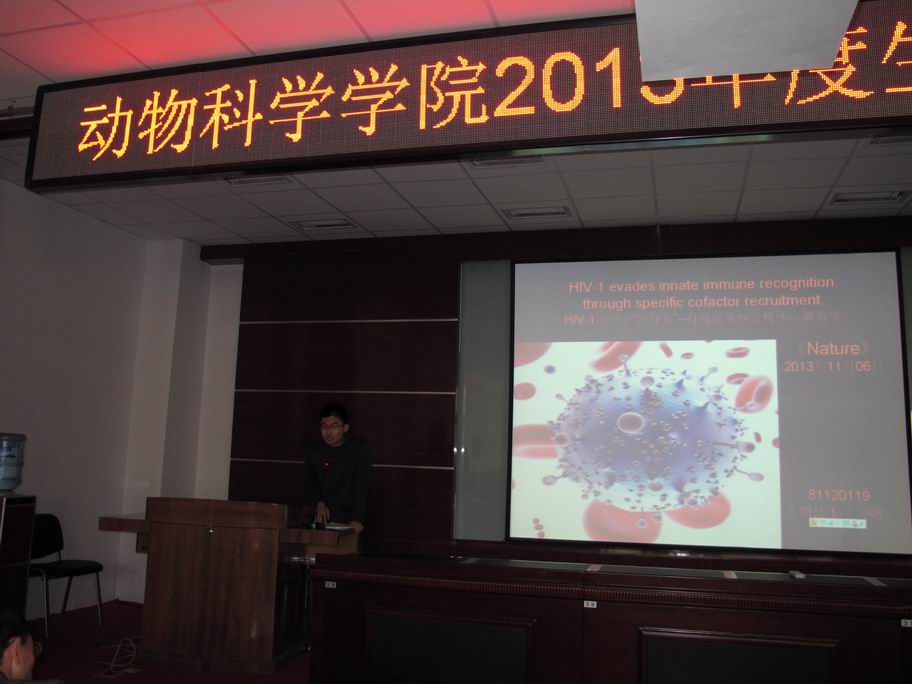 2013年秋季学期,今年会动物生物技术系结合专业课教学,在2012级生物技术专业中开展了生物化学报告会教学改革实践活动。报告会先后举办了6场,副院长欧阳红生教授全程参加了报告会并进行讲评指导。报告会共评出一等奖2名,二等奖2名,三等奖4名,优秀组织奖4名。
