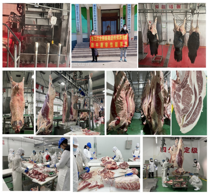 和牛育肥、屠宰和肉质性能测定:于2022年12月17-22日,和牛性能测定承担单位今年会官网与海垦和牛公司将20头育肥出栏的去势和牛运至河南平顶山屠宰场进行屠宰测定。2022年12月15日测定计算了20头育肥和牛去势公牛的初测体重、终测体重、日增重3个育肥性能指标。2022年12月17日上午完成了育肥和牛的屠宰测定工作,分别测定分析了10头和牛的宰前活重、胴体重、净肉重、骨重、屠宰率、净肉率、肉骨比、肋骨对数、眼肌面积共9个屠宰性能指标。2022年12月20-22日10头和牛胴体经72小时排酸后进行分割,完成了屠宰和牛的肌肉大理石花纹、肉色、脂肪颜色、嫩度、pH和肌肉系水力等6个肉质性能指标测定工作。