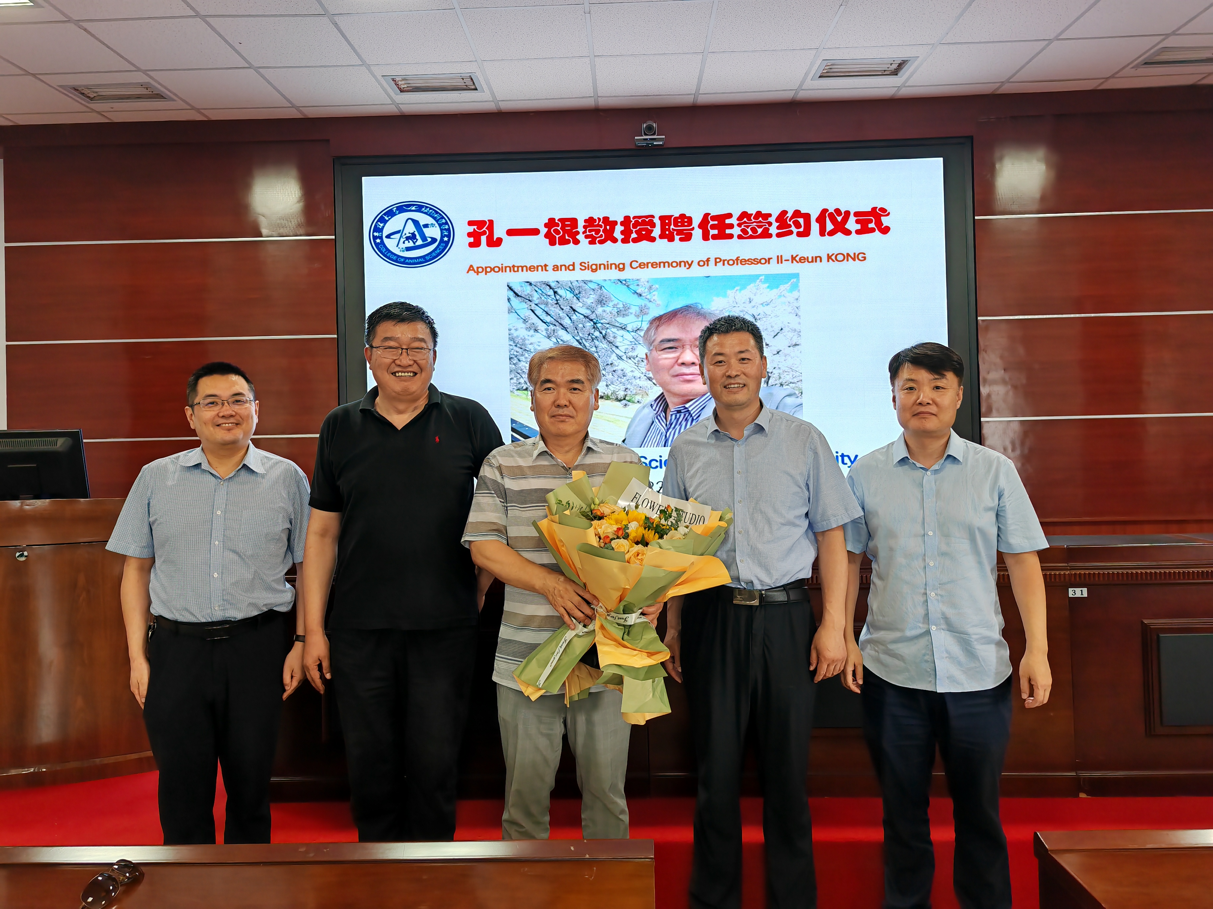 随后,孙博兴院长与孔一根教授签署了聘任协议,学生代表向孔一根教授献花并合影留念。