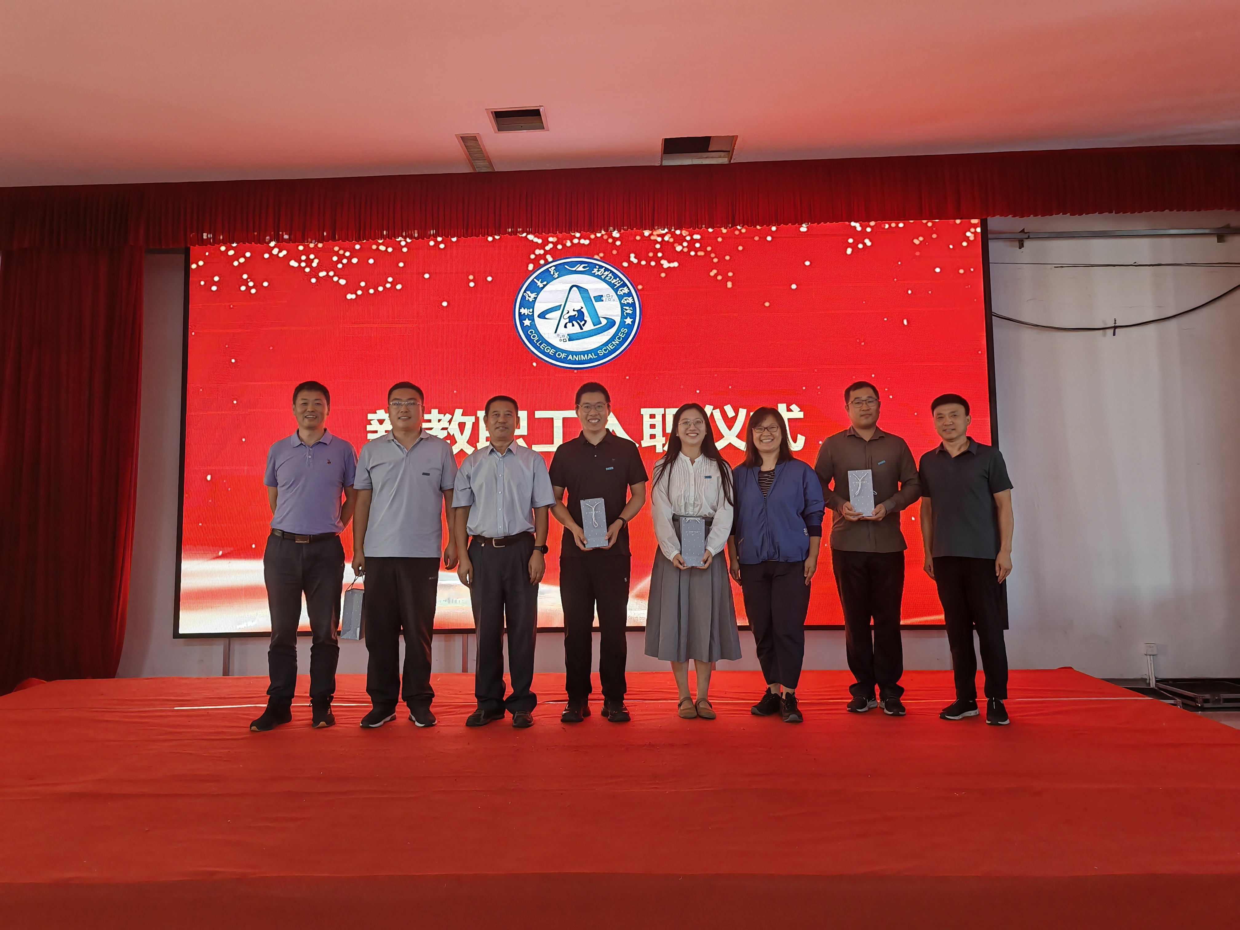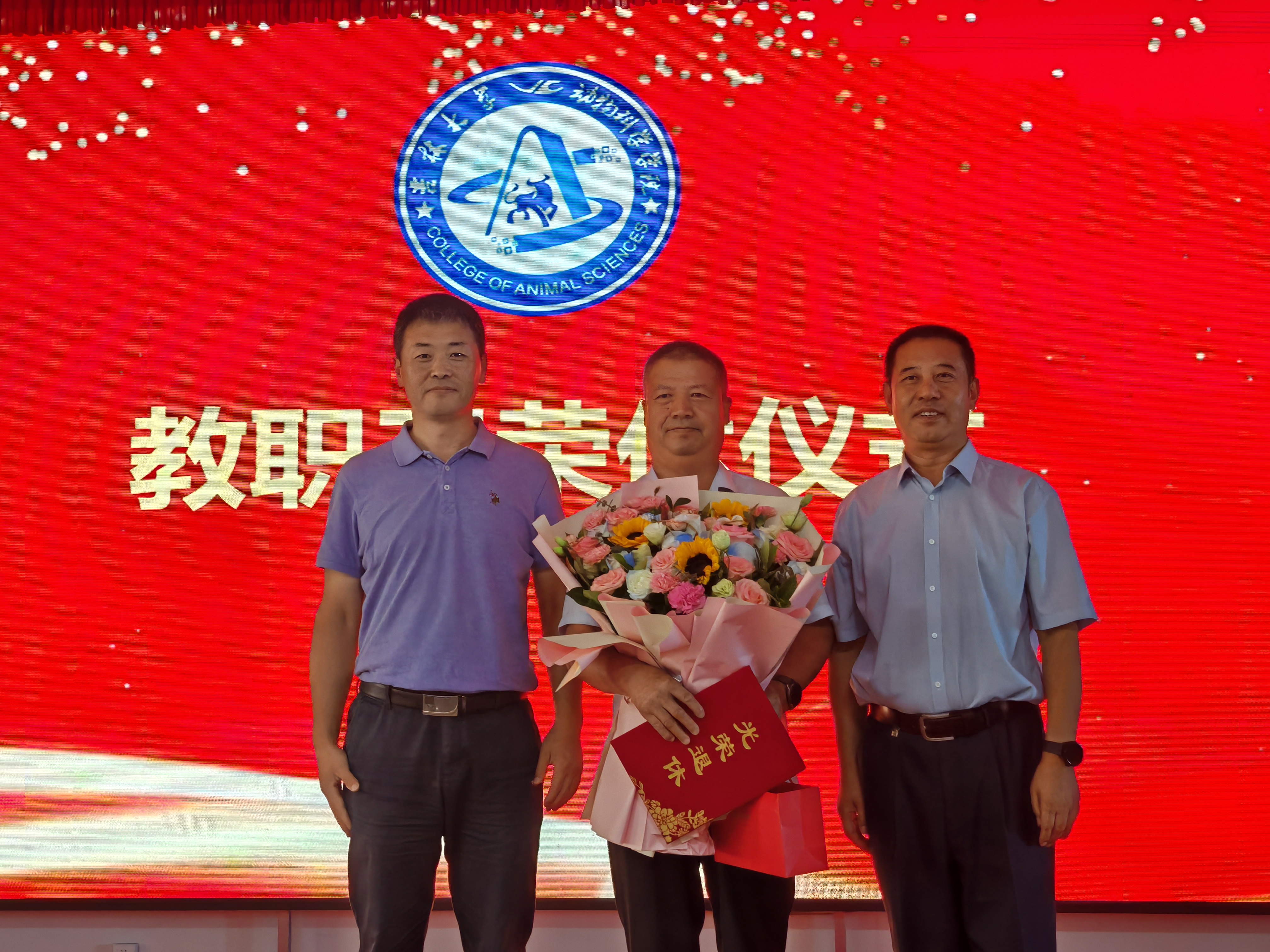 随后,举行新教职工入职仪式和教师荣休仪式。班子成员为2024年新入职教职工代表佩戴今年会官网校徽并发放学院纪念品,党委书记高福和为退休教师沈景林教授颁发荣休证书,青年教工代表杨琳为沈景林教授敬献鲜花并合影留念。沈景林教授在退休感言中回顾自己32年的从教经历,用3个感谢,3个不舍和4个祝愿倾诉了自己对学院、对师生和对畜牧学科的深切情感,在鲜花和掌声中正式告别讲台,迈向人生新的篇章。