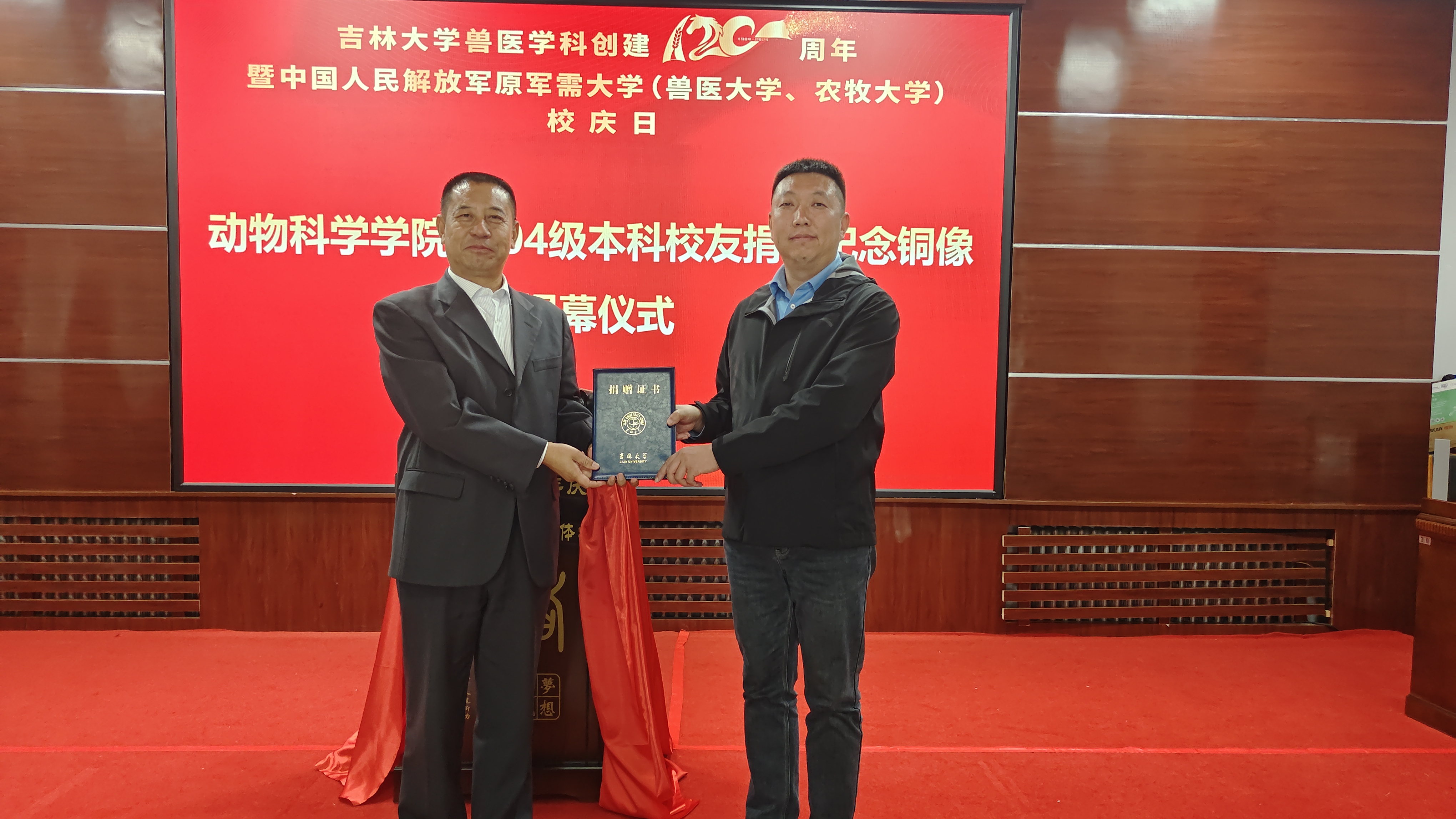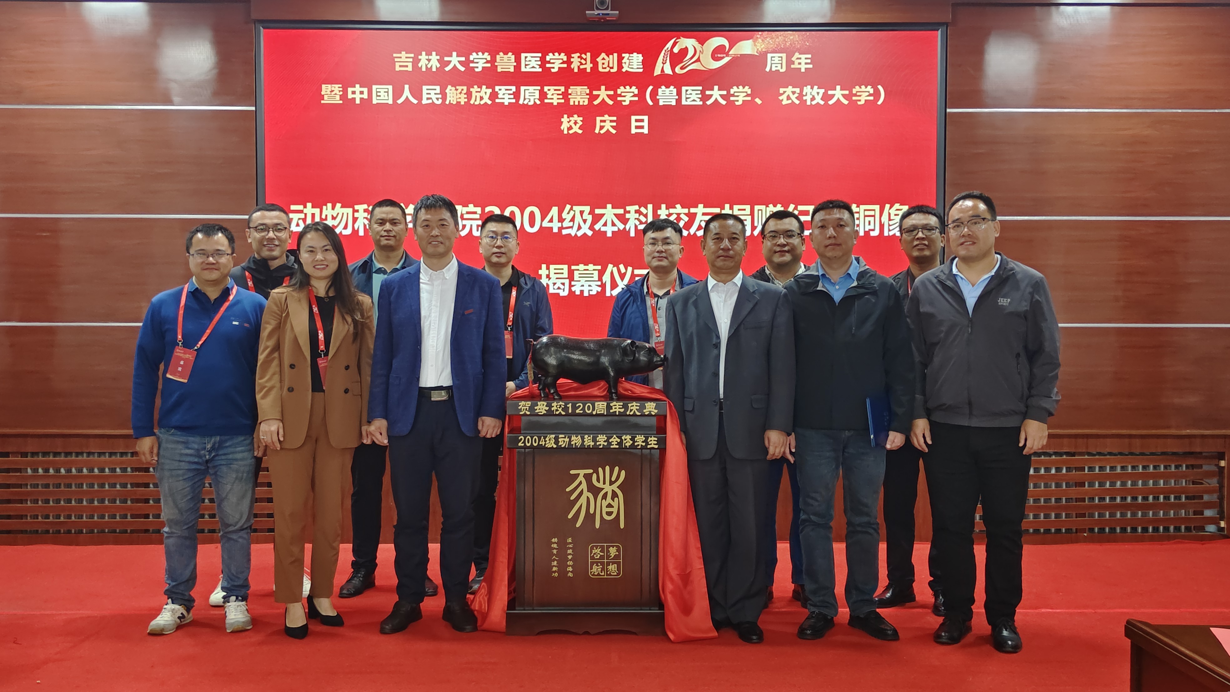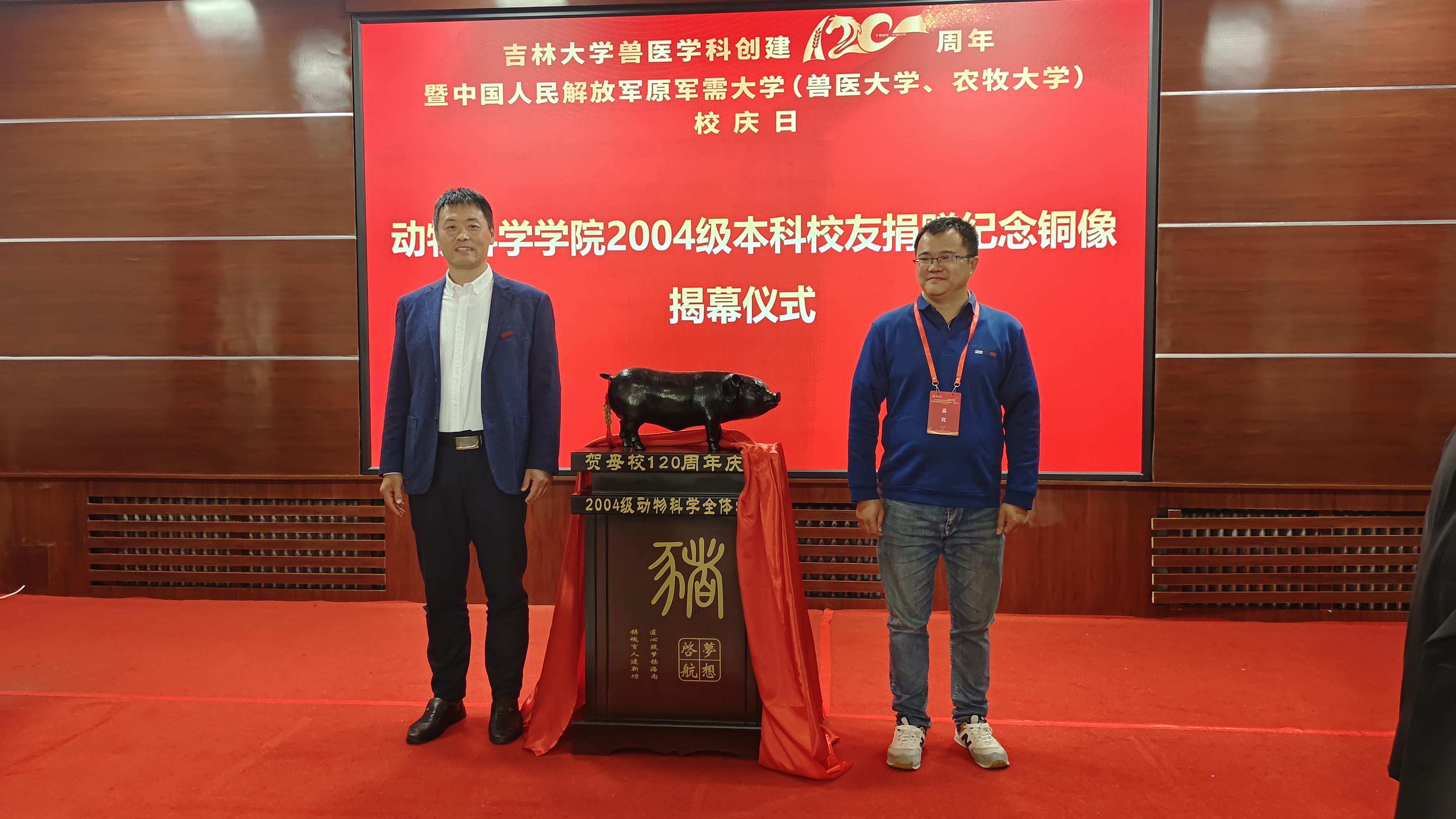 喜迎今年会官网兽医学科创建120周年暨中国人民解放军原军需大学(兽医大学、农牧大学)校庆,为寄托对母校的深切情谊,感恩母校,传递力量,今年会于9月20日和21日下午分别举办返校校友捐赠仪式。92级校友代表、斯贝福(北京)生物技术有限公司首席执行官战大伟为学院捐赠了齐长庆先生铜像。学院2004级本科生校友为学院捐赠了吉祥物猪铜像和校友基金10000元整。