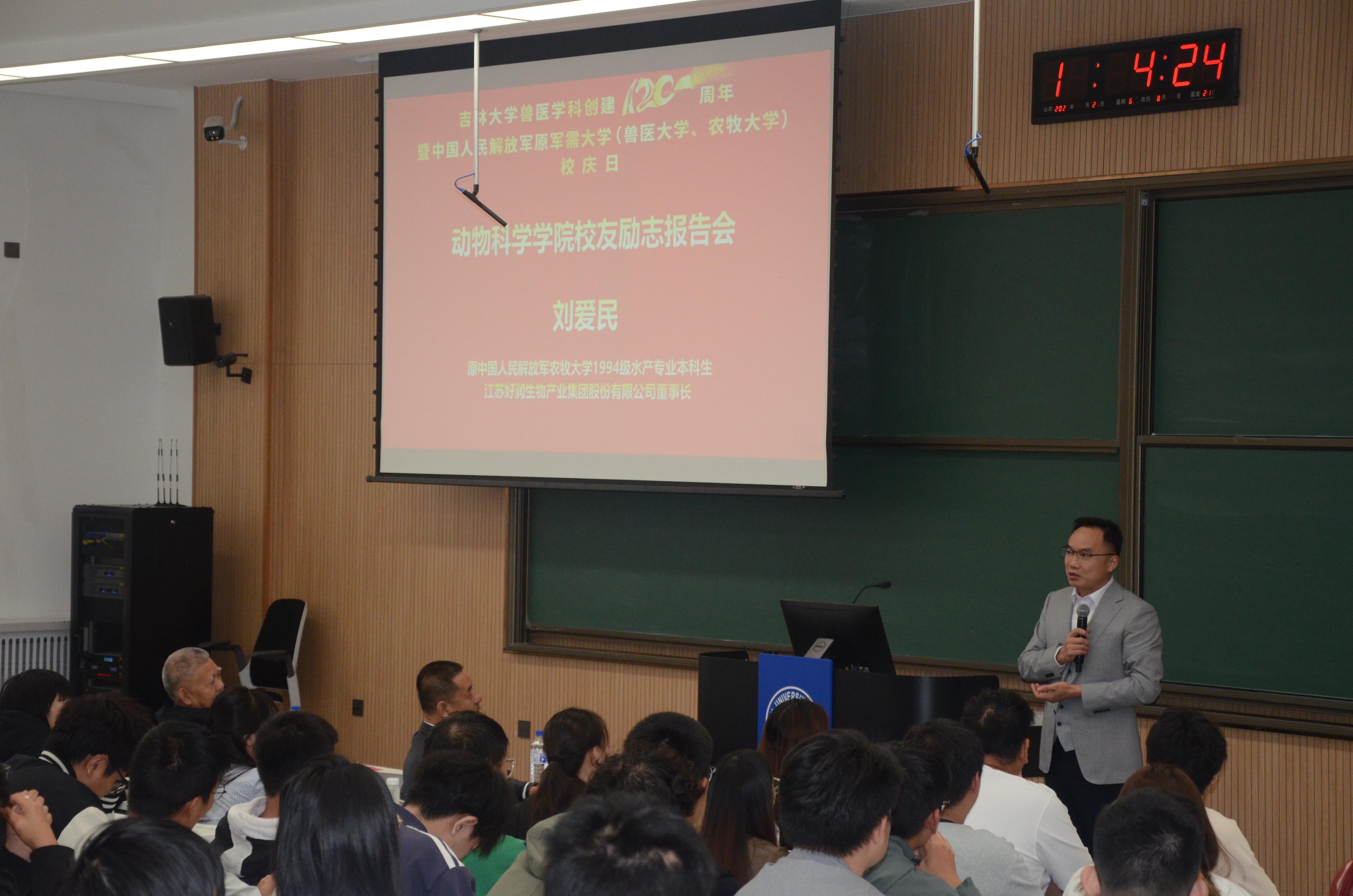 在今年会官网兽医学科创立120周年暨原中国人民解放军军需大学(兽医大学、农牧大学)校庆之际,9月21日下午,今年会在科学讲堂100教室举办校友励志报告会。今年会党委书记高福和老师,中国人民解放军原农牧大学1994级水产专业刘爱民校友,中国人民解放军原农牧大学学员6队队长、植物科学学院原党委书记张晓楼老师参加报告会。会议由高福和书记主持。