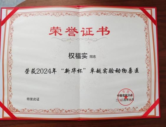 同时,在论坛期间举办了中国兽医协会2024年“新华杯”卓越实验动物兽医颁奖活动,经过前期的推选与评审,共产生了20位卓越实验动物兽医,权福实副教授荣获卓越实验动物兽医奖项。