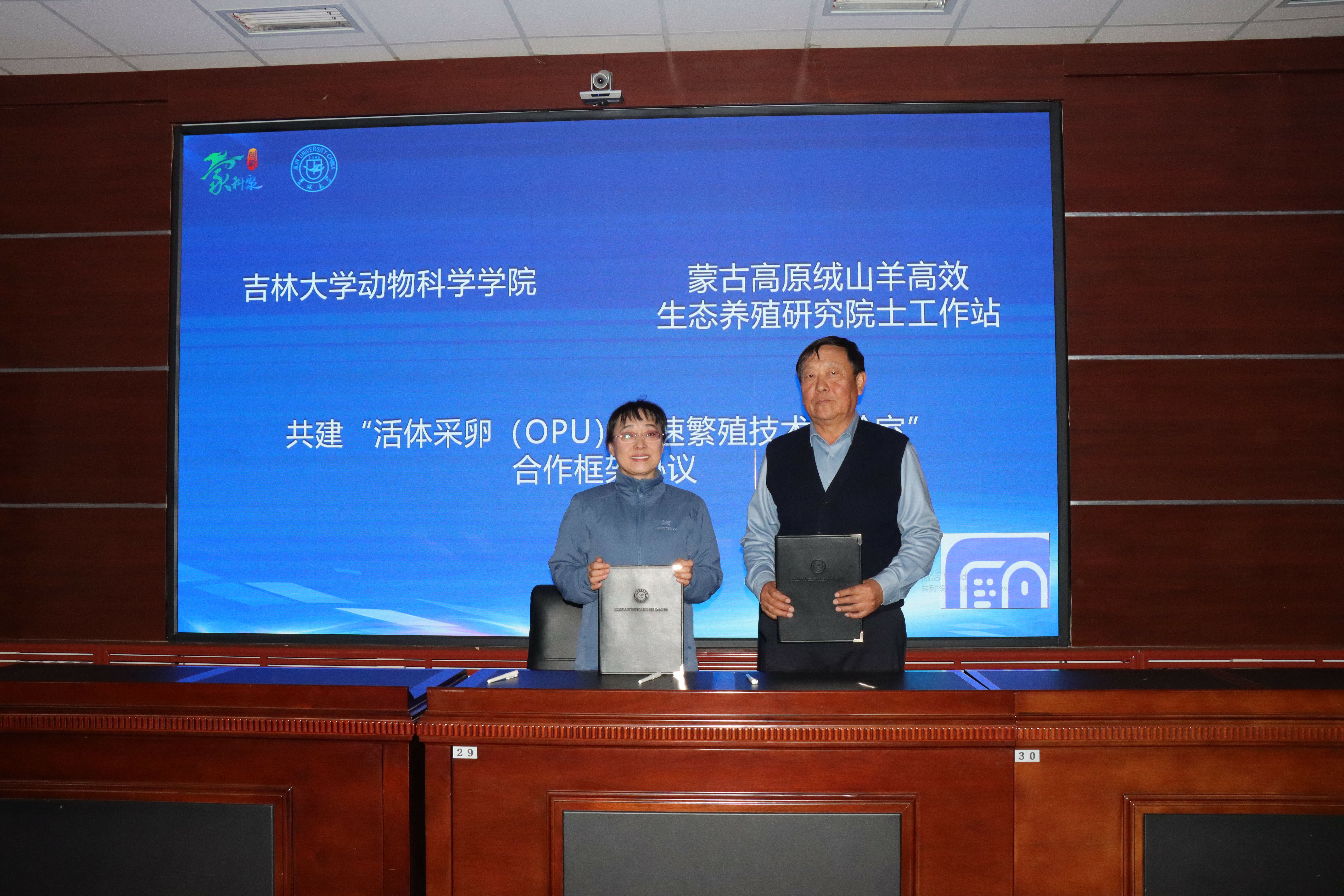 签约仪式上,逄大欣与郝巴雅斯胡良共同签署《肉牛种质创新与智慧养殖现代产业学院与蒙古高原绒山羊高效生态养殖研究院士工作站共建“活体采卵(OPU)快速繁殖技术实验室”合作框架协议》。