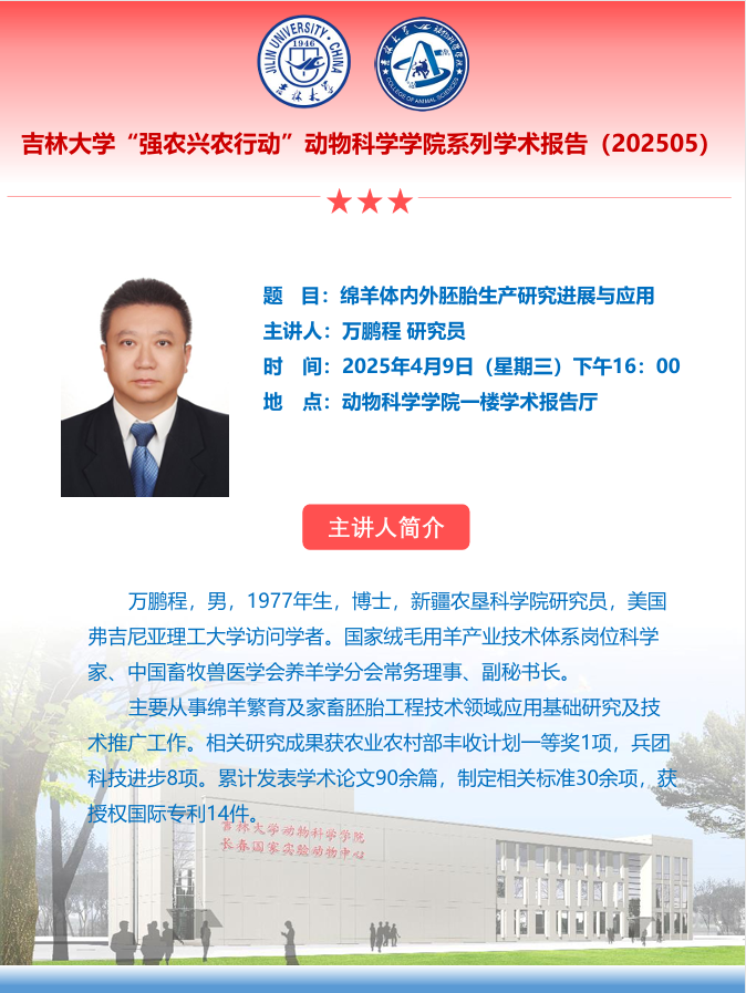 万鹏程,男,1977年生,博士,新疆农垦科学院研究员,美国弗吉尼亚理工大学访问学者。国家绒毛用羊产业技术体系岗位科学家、中国畜牧兽医学会养羊学分会常务理事、副秘书长。
