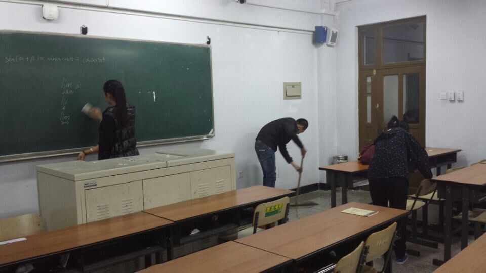 下午四点院学生会外联志工部同学集合完毕,前往目的地。首先同学们来到图书馆,协助老师整理书籍,并主动打扫馆内卫生。为了不打扰认真自习的学生,同学们的一举一动都小心翼翼。接着, 伴着冷冽的秋风,同学们又来到科学讲堂打扫楼道和教室。在教室中擦黑板,清扫地面,摆放桌椅……使原本脏乱的教室转眼间整洁起来。同学们的辛苦劳作给这寒风染上了一丝暖意,温暖了整个秋天。